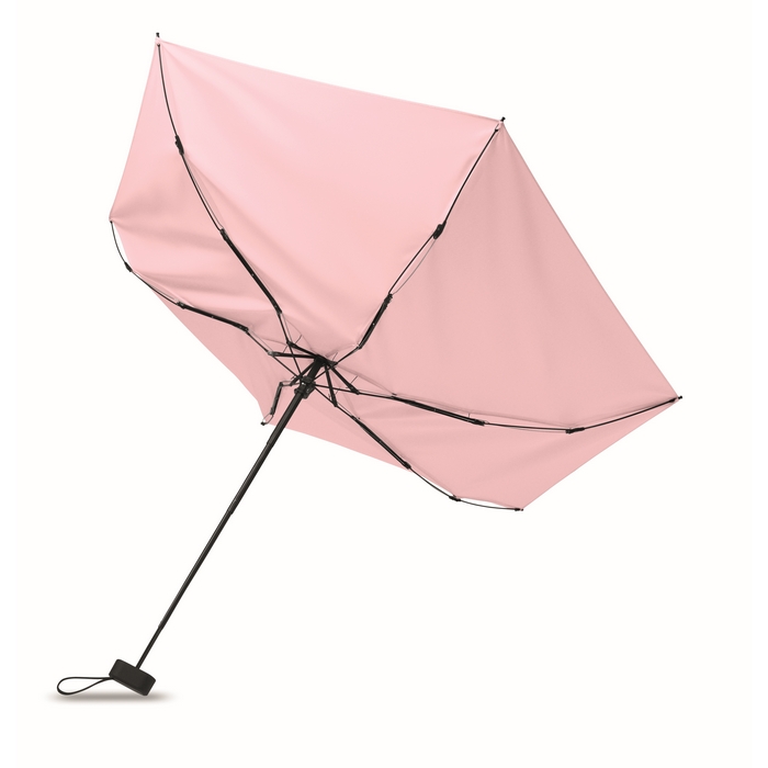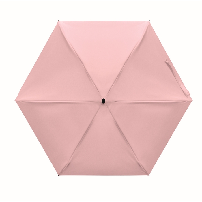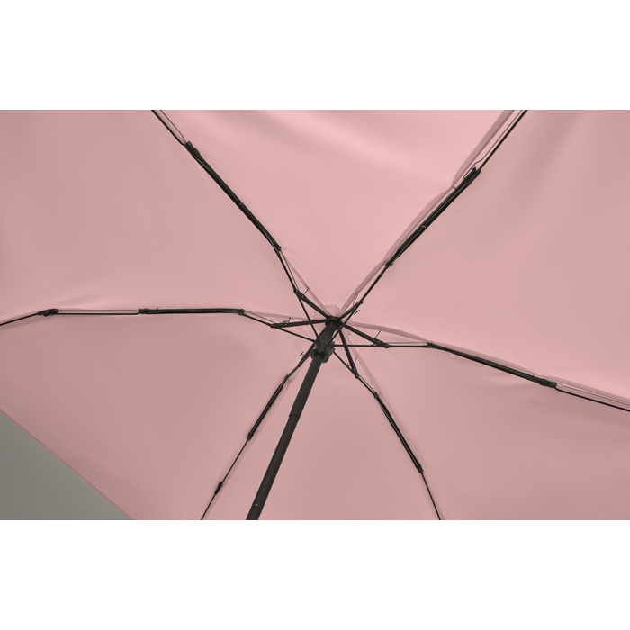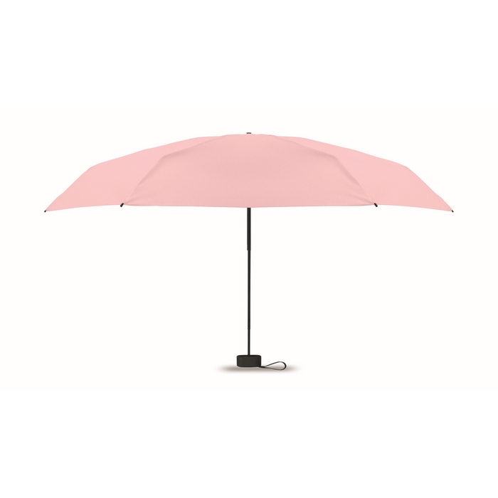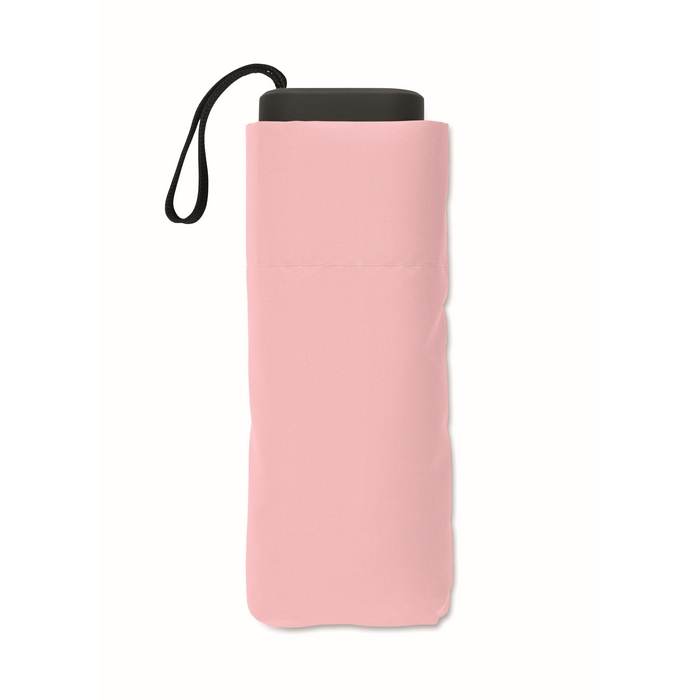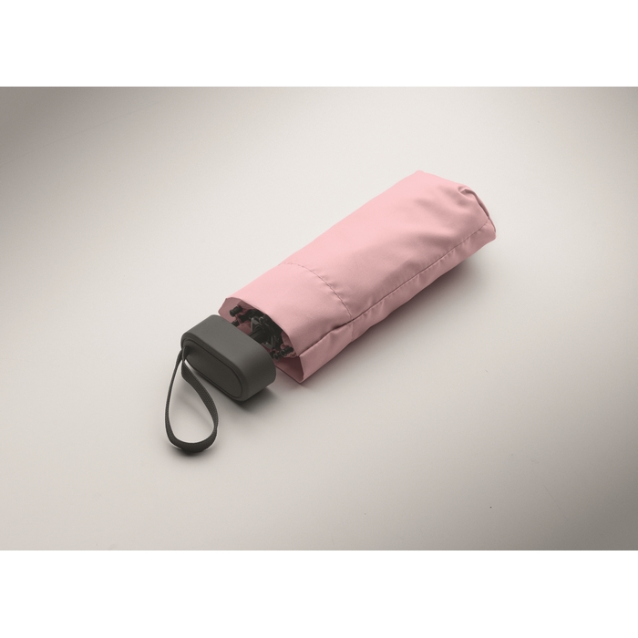 19-inch 5-fold manual umbrella made of 190T pongee with matching pouch. It has a metal and fibreglass windproof frame, black rubberized handle with wrist strap, and compact 17 cm folded size. Dimensions: O90 x 17 cm