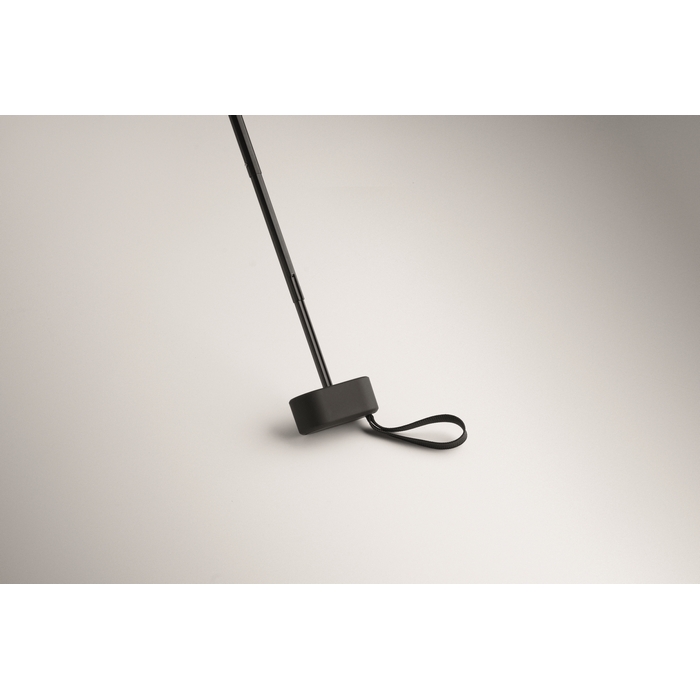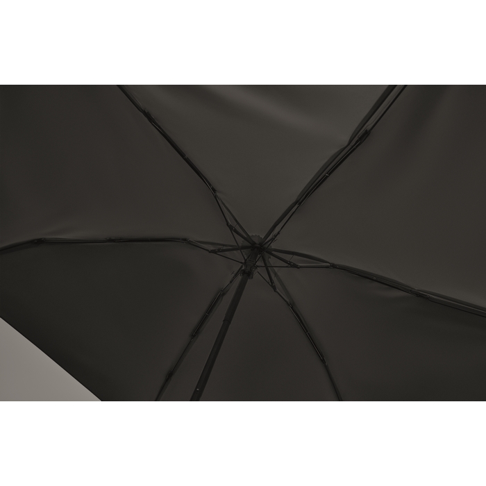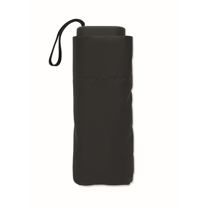 19-inch 5-fold manual umbrella made of 190T pongee with matching pouch. It has a metal and fibreglass windproof frame, black rubberized handle with wrist strap, and compact 17 cm folded size. Dimensions: O90 x 17 cm
