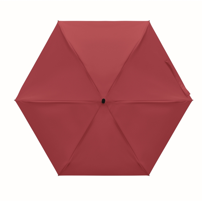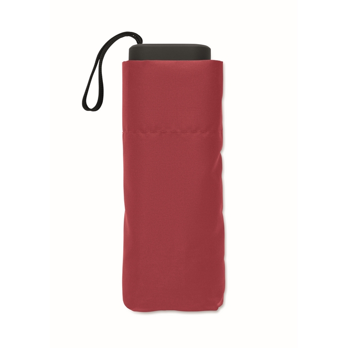 19-inch 5-fold manual umbrella made of 190T pongee with matching pouch. It has a metal and fibreglass windproof frame, black rubberized handle with wrist strap, and compact 17 cm folded size. Dimensions: O90 x 17 cm