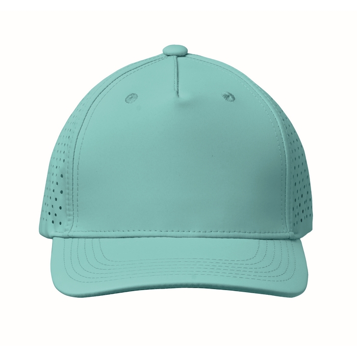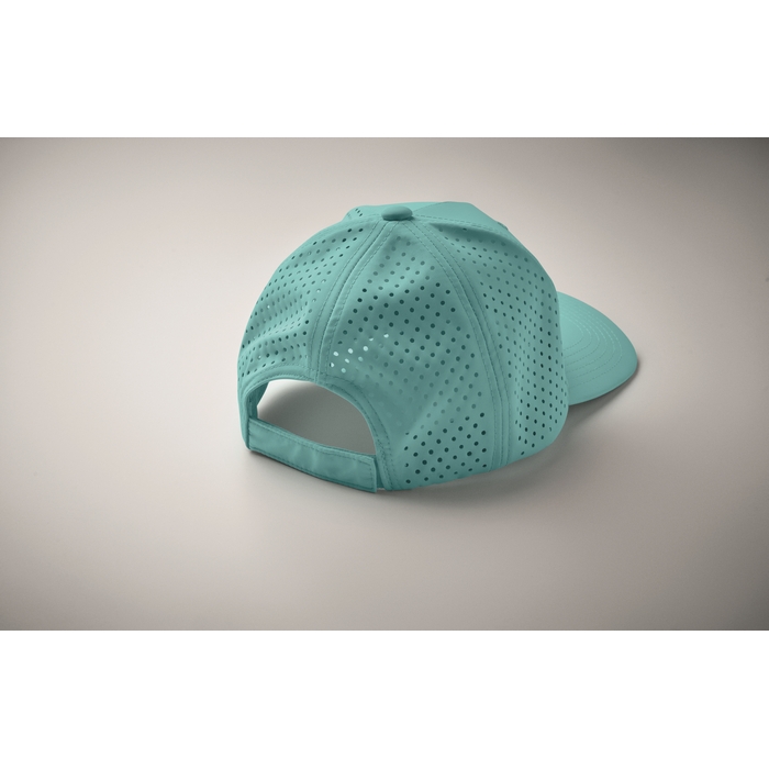 5 panel polyester performance cap with adjustable hook and loop closure and laser perforated holes with 2 stitched eyelets in matching colour. Item is quick dry, sweat and water repellent. 130 gr/m2 Dimensions: 21 x 16 x 11 cm