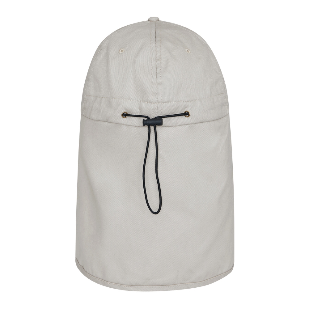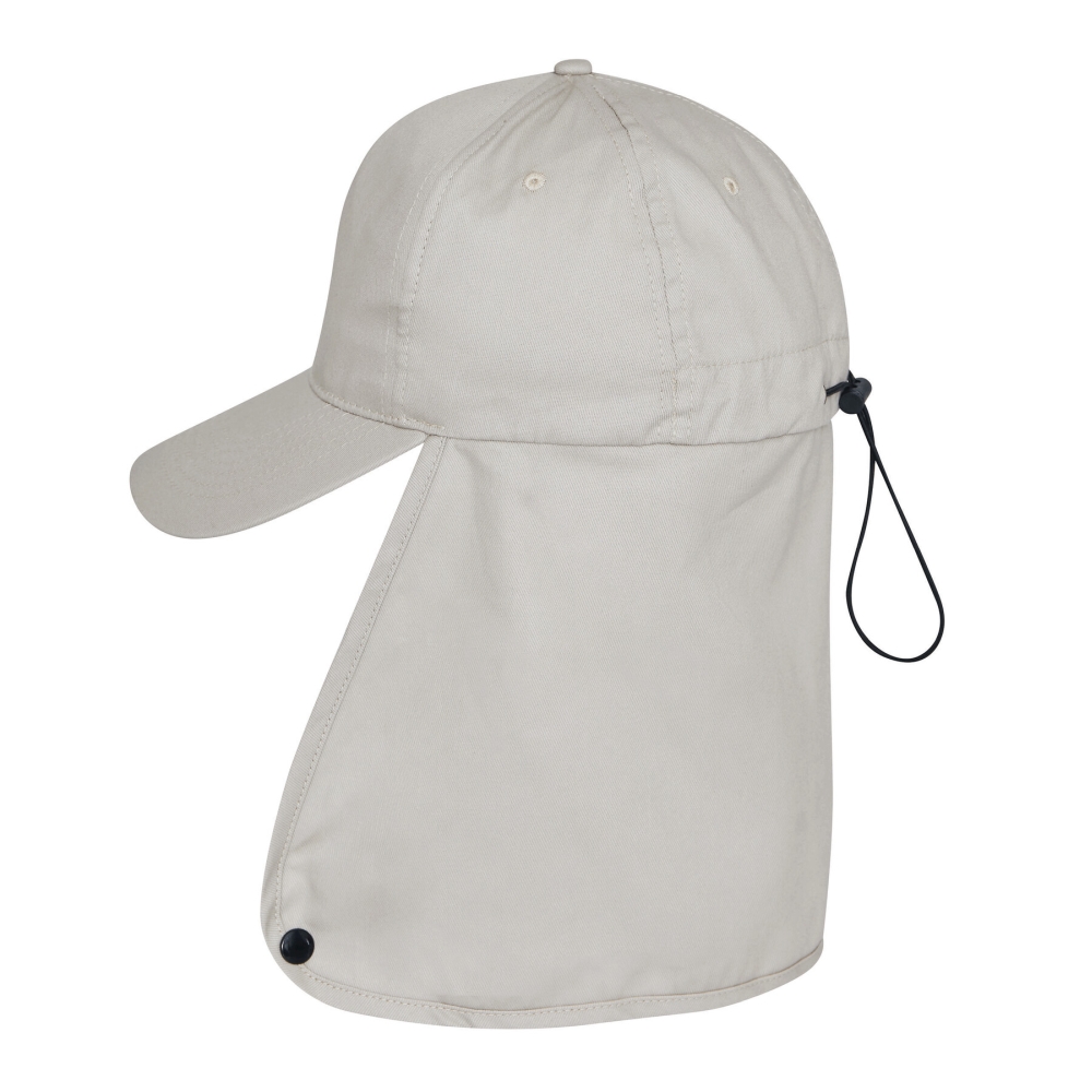 5-panel baseball cap: reinforced front panel, 4 embroidered ventilation eyelets, button on top, drawstring with stopper for size adjustment, long neck flap with snap fastener – for outdoor activities and protection against sunburn, with UPF 50+ sun protection.