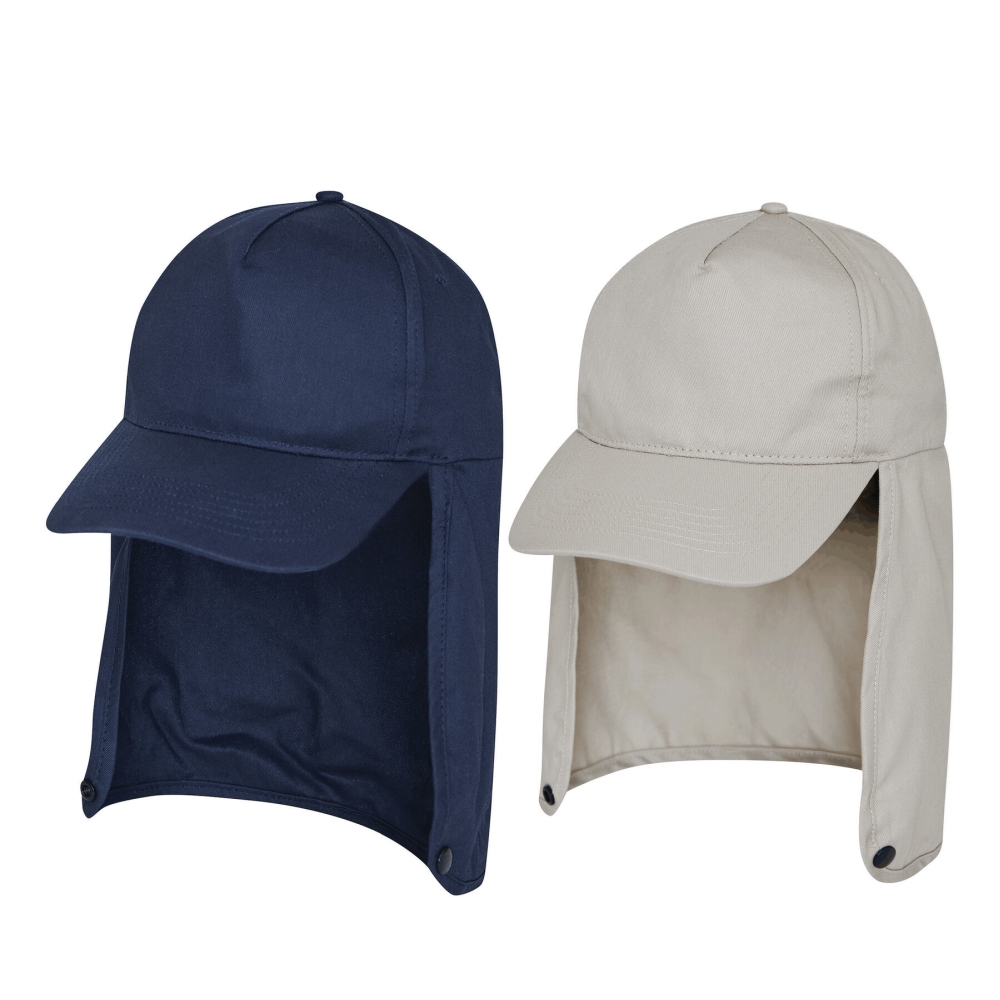 5-panel baseball cap: reinforced front panel, 4 embroidered ventilation eyelets, button on top, drawstring with stopper for size adjustment, long neck flap with snap fastener – for outdoor activities and protection against sunburn, with UPF 50+ sun protection.