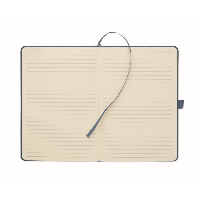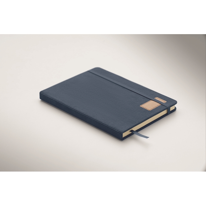 A5 notebook with hard RPET polyester corduroy cover and 192 lined recycled paper pages (70 gr/m2). Casebound design with elastic band closure, pen loop, ribbon page marker, and washed kraft paper tag. Dimensions: 210 x 145 cm
