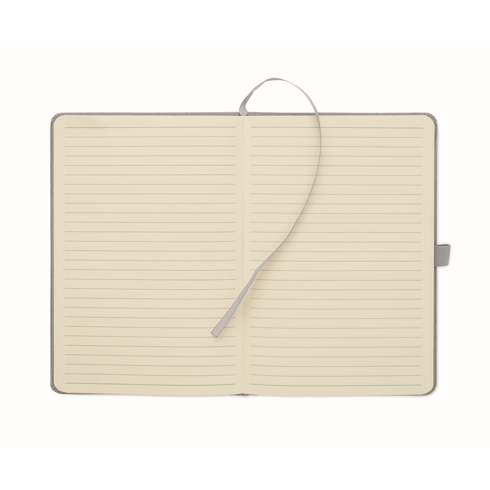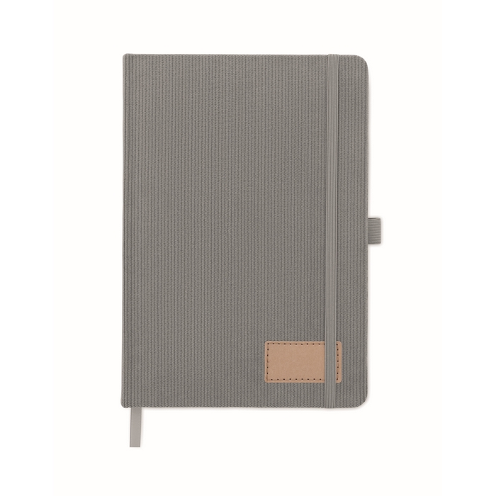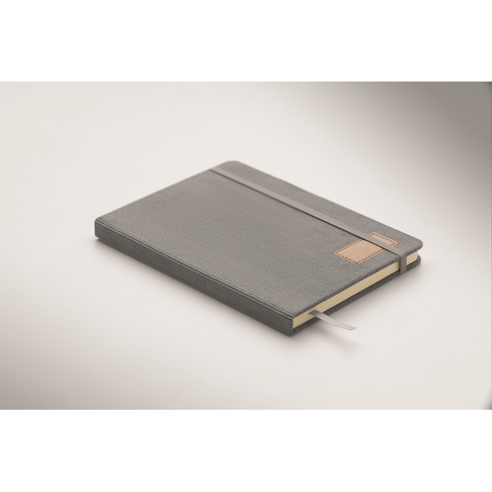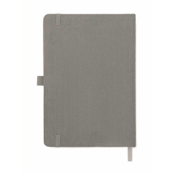A5 notebook with hard RPET polyester corduroy cover and 192 lined recycled paper pages (70 gr/m2). Casebound design with elastic band closure, pen loop, ribbon page marker, and washed kraft paper tag. Dimensions: 210 x 145 cm
