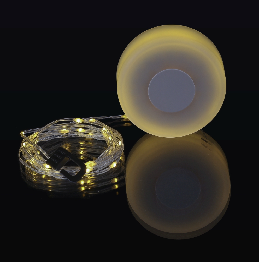 ABS light with a rechargeable camping lamp featuring two light functions. Includes an 8-meter light string that can be retracted with a spool. Powered by a 1,000 mAh battery with Type-C charging. Individually packaged in a brown cardboard box. High: 4,8 cm