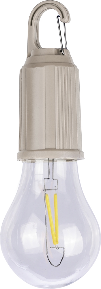 ABS lightbulb (60 lumens) with a 400mAh rechargeable battery. USB-C charging type. Features a metal clip and three light modes. IPX3. Dimensions: 17,4 cm x 6 cm