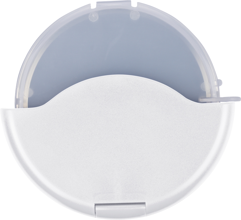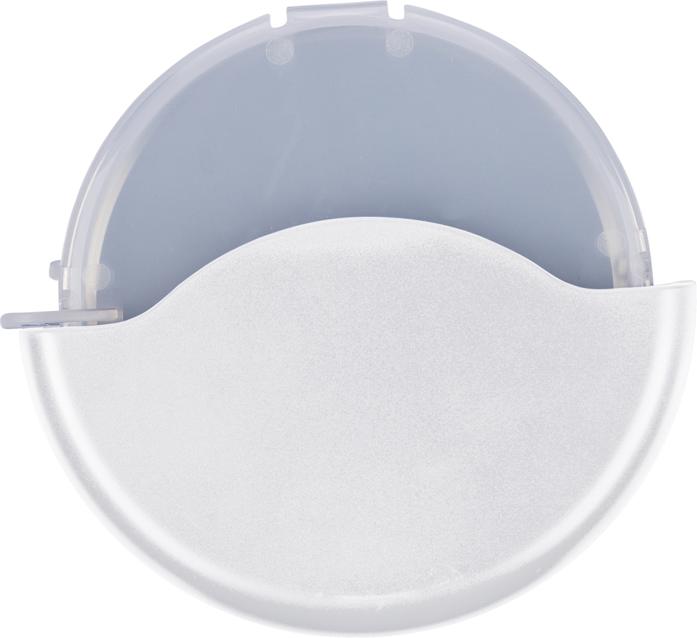ABS and PP pizza cutter with stainless steel 430 blade. Features a removable cassette that clicks open for easy cleaning and blade access. Packed in a recycled polybag. Dimensions: 1,6 cm x 9,5 cm