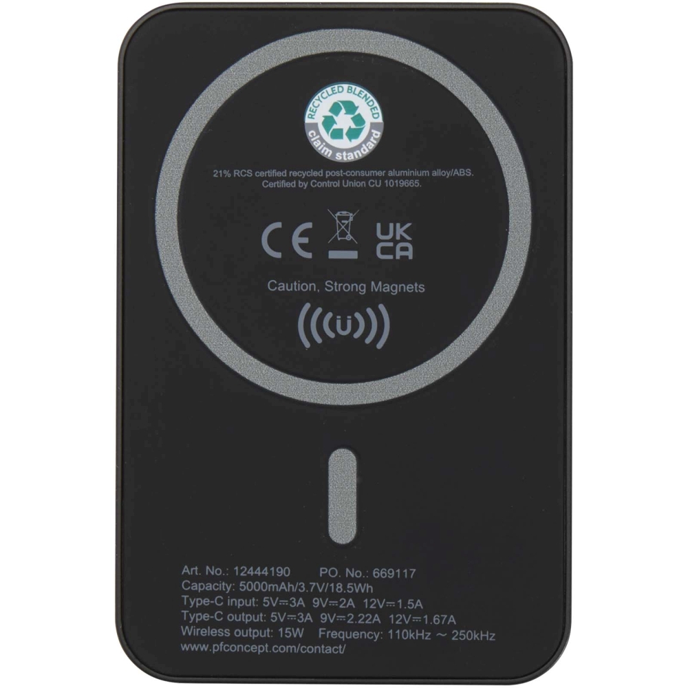 Acrab 5000 mAh 15W magnetic wireless power bank with 20W PD - made from recycled plastic, solid black