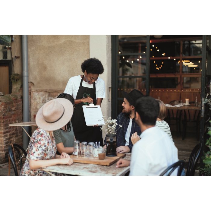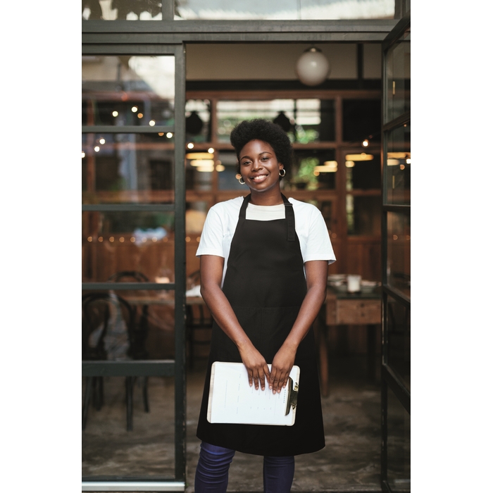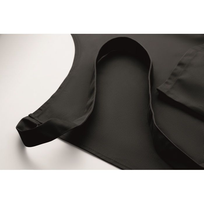 Long adjustable kitchen apron in 240 gr/m2 polycotton (35% cotton, 65% polyester) with two front pockets and adjustable strap with metal buckle. Dimensions: 75 x 90 cm