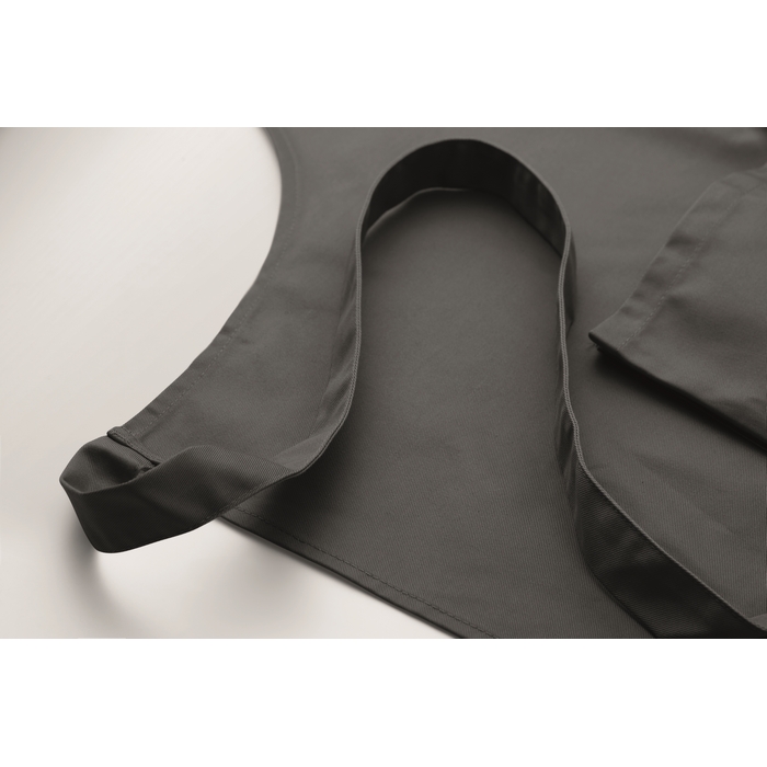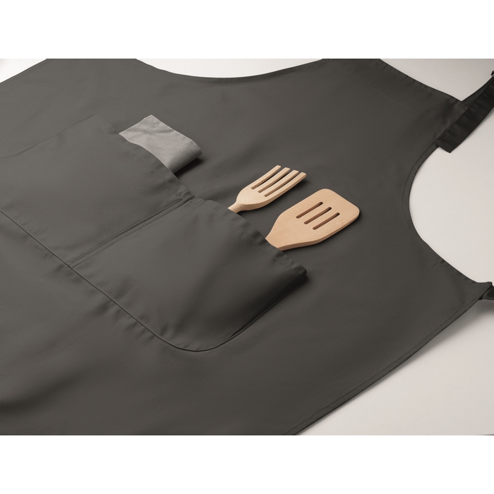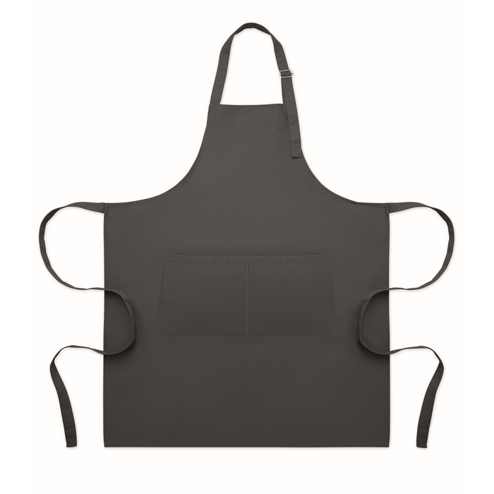 Long adjustable kitchen apron in 240 gr/m2 polycotton (35% cotton, 65% polyester) with two front pockets and adjustable strap with metal buckle. Dimensions: 75 x 90 cm