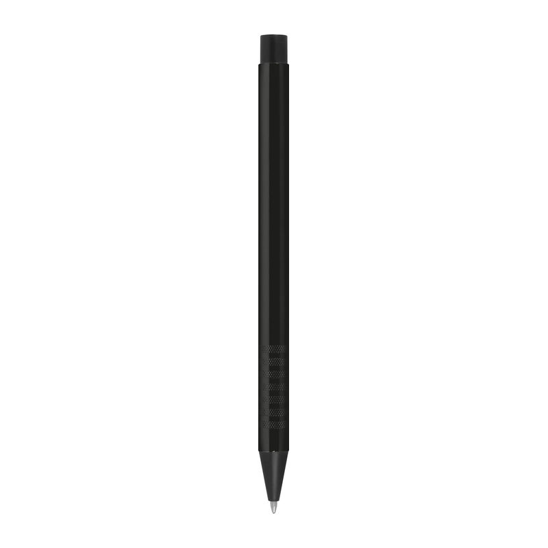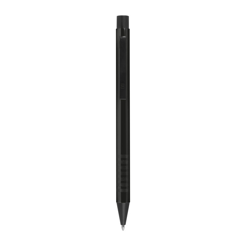 Metal ballpoint pen with blue-writing refill and fancy grip zone. Your advertisement will be engraved to the right of the clip.