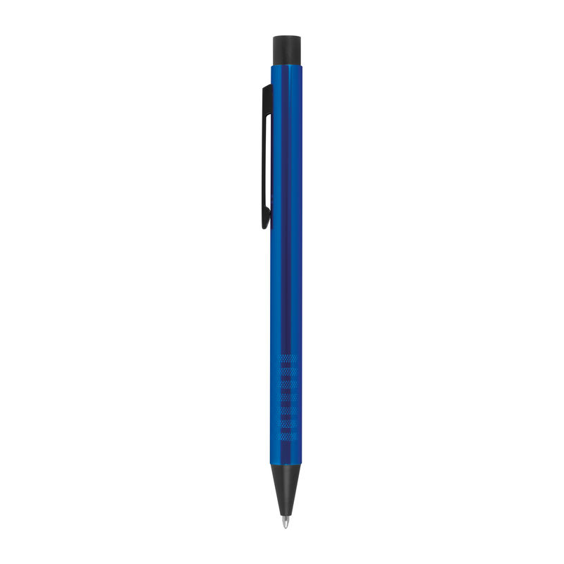Metal ballpoint pen with blue-writing refill and fancy grip zone. Your advertisement will be engraved to the right of the clip.