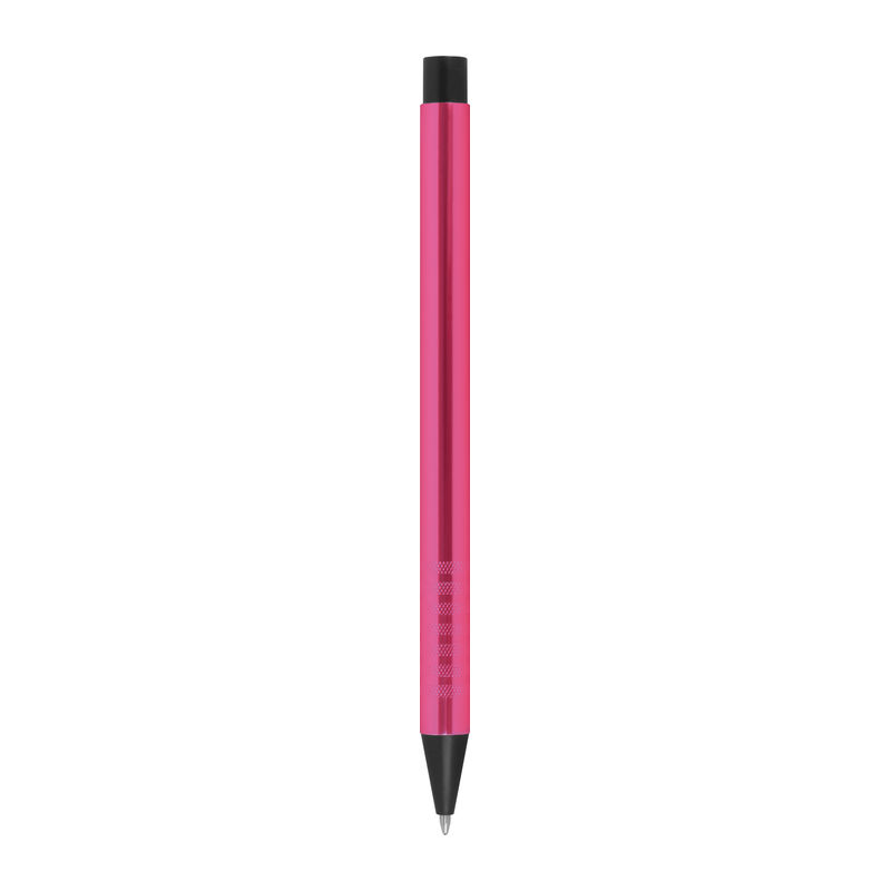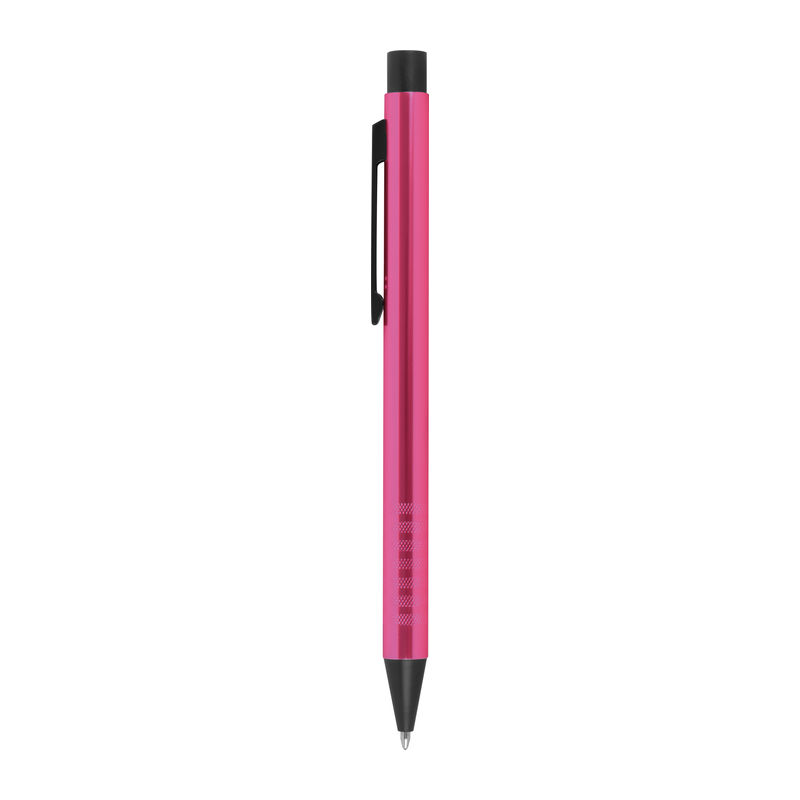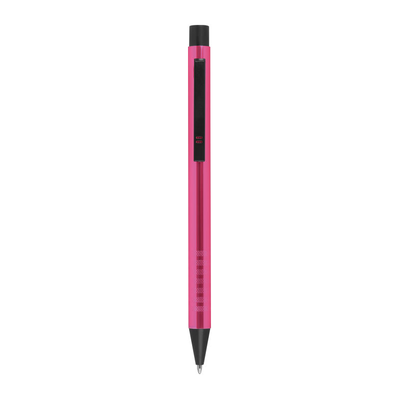 Metal ballpoint pen with blue-writing refill and fancy grip zone. Your advertisement will be engraved to the right of the clip.