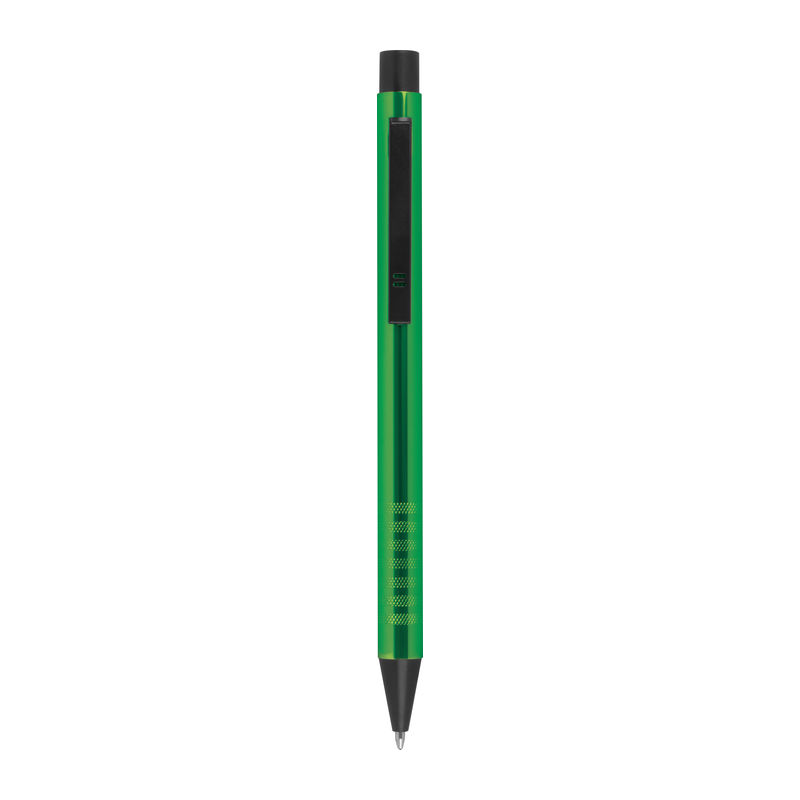 Metal ballpoint pen with blue-writing refill and fancy grip zone. Your advertisement will be engraved to the right of the clip.
