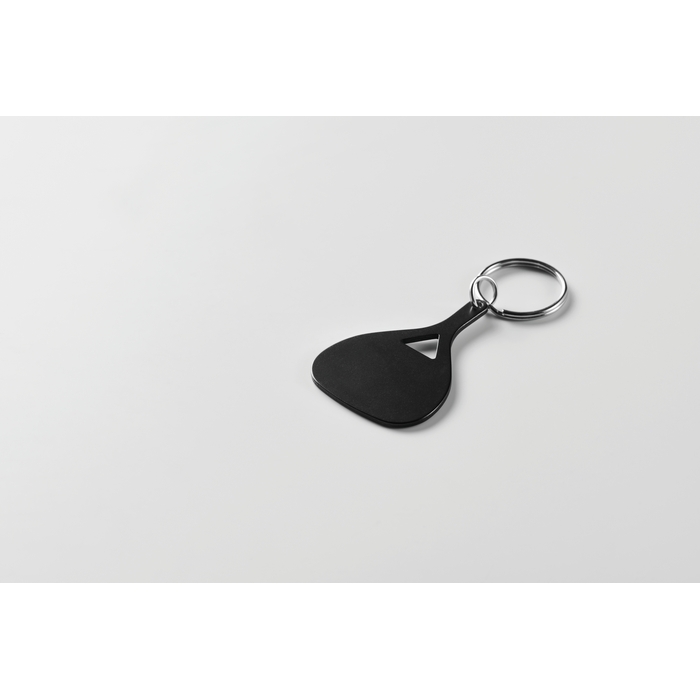 Recycled aluminium paddle-shaped keyring. Dimensions: 3.8 x 5.4 x 0.17 cm