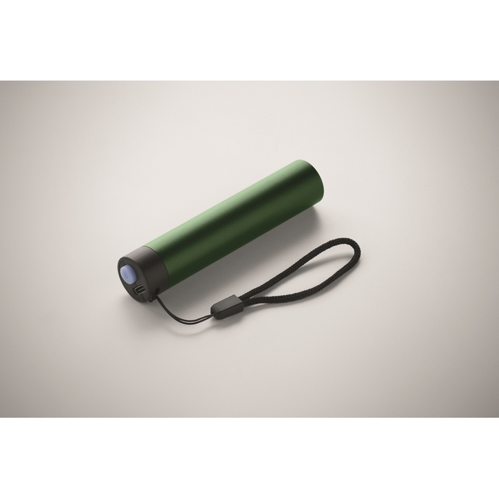 Recycled aluminium rechargeable torch 110 lumen with 3 light settings. 1 replaceable and rechargeable 14500 lithium battery 400 mAh. Dimensions: 2.1 x 2.1 x 10 cm