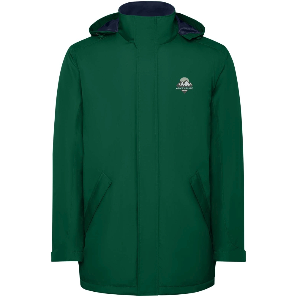 Waterproof padded parka jacket for men. High collar with folded and removable hood with hook & loop closure. Matching central zipper with flap. Side pockets with zipper and fixed flap. Interior pocket with hook & loop closure. Adjustable cuffs with hook & loop belt loop. Interior access for reinforcements on the back and left chest.