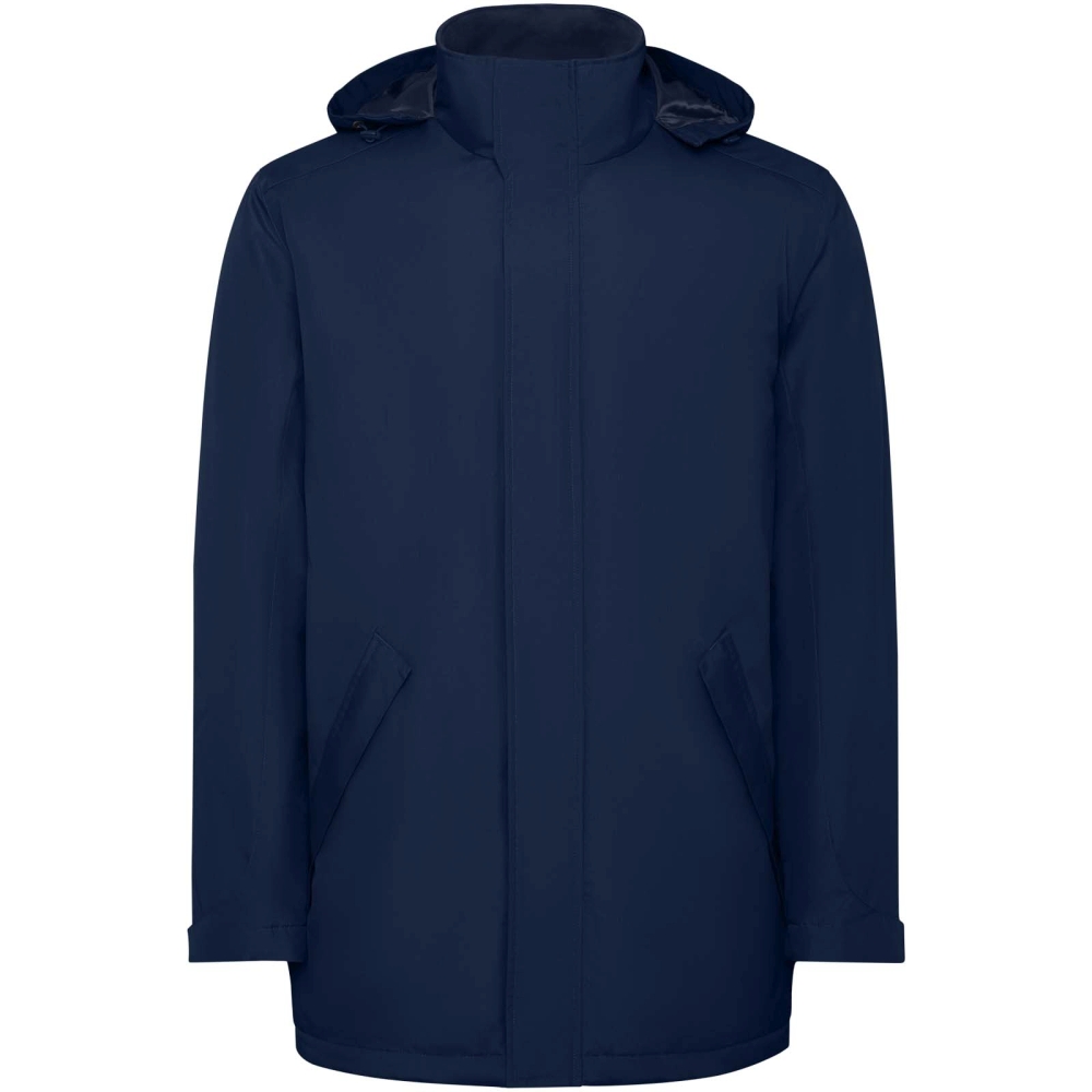 Waterproof padded parka jacket for men. High collar with folded and removable hood with hook & loop closure. Matching central zipper with flap. Side pockets with zipper and fixed flap. Interior pocket with hook & loop closure. Adjustable cuffs with hook & loop belt loop. Interior access for reinforcements on the back and left chest.