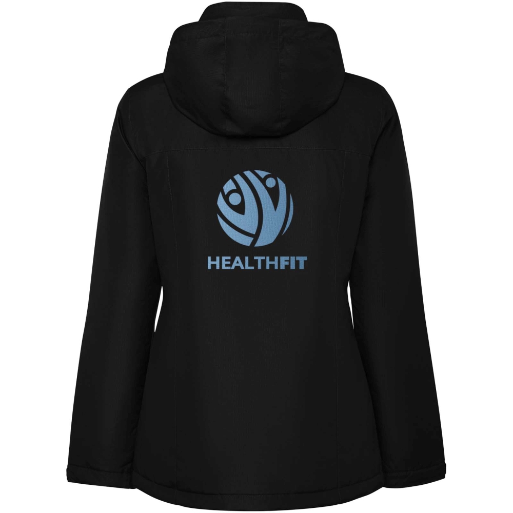 Waterproof padded parka jacket for women. Slim-fit. High collar with folded and removable hood with hook & loop closure. Matching central zipper with flap. Side pockets with zipper and fixed flap. Interior pocket with hook & loop closure. Adjustable cuffs with hook & loop belt loop. Interior access for reinforcements on the back and left chest.