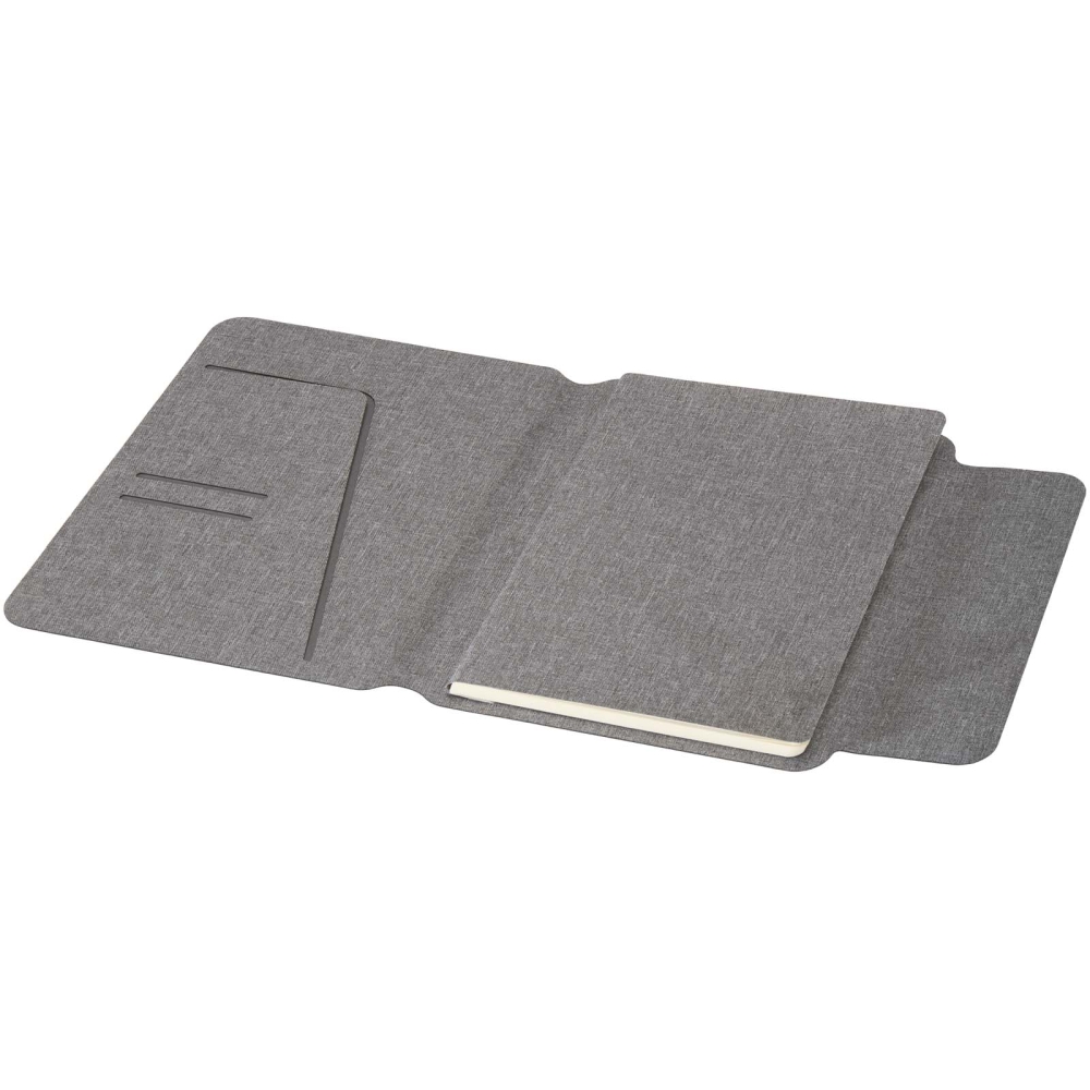 The Andean A5 portfolio is partly made from RCS certified recycled post-consumer polyester, offering a more sustainable alternative by reducing reliance on virgin materials. Designed with a sleek grey hard cover featuring rounded corners and precision welded technology, it is secured with a magnetic closure accented by a refined walnut wood detail—adding a modern and sophisticated touch. Inside, youll find a removable softcover notebook with 64 cream-coloured lined sheets, made from 80 g/m2 responsibly sourced paper. Presented in a kraft-coloured paper sleeve. Dimensions: 20 x 17 cm