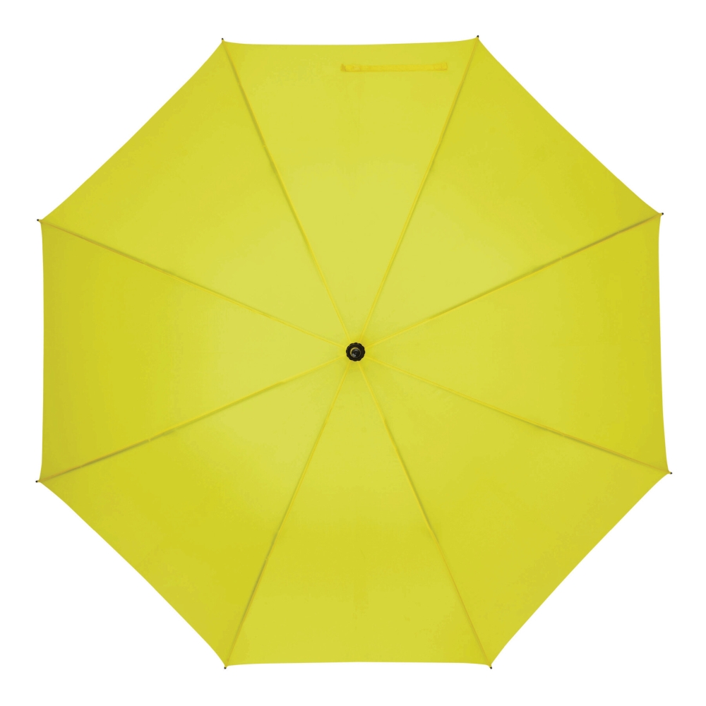 Automatic golf umbrella with fibreglass shaft, fibreglass ribs, plastic tips, EVA handle with integrated press button, polyester pongee canopy made from recycled plastic / rPET, closing strap with Velcro. Dimensions: O130 / 102 cm