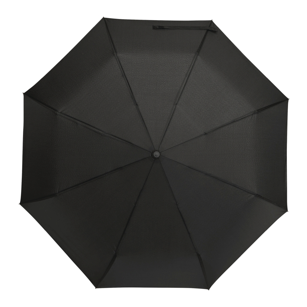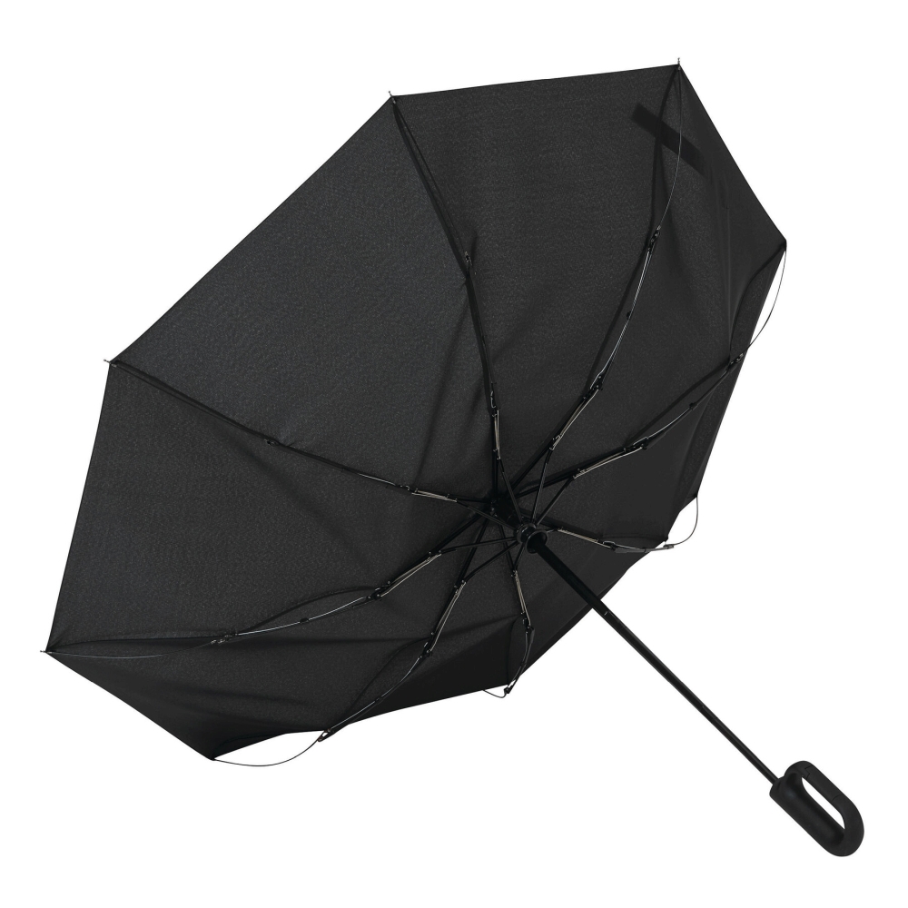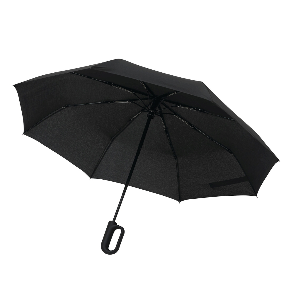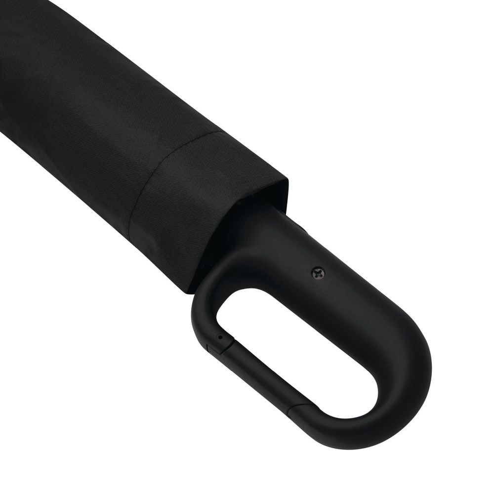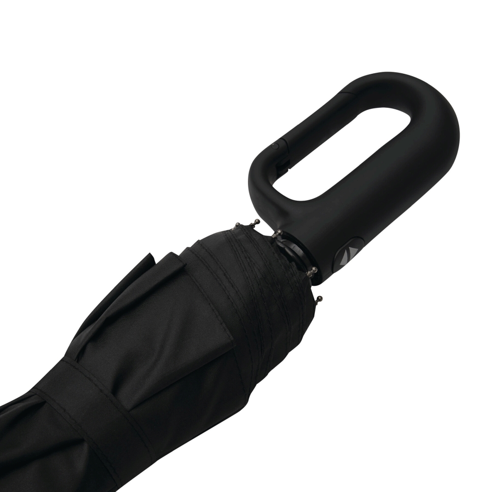 Automatic open/close windproof pocket umbrella with sheath in matching colour: 3-section metal shaft, with metal/fibreglass ribs and metal tips, rubber-coated carabiner handle, polyester pongee canopy made from recycled plastic / rPET, closing strap with Velcro. Dimensions: O98 / 33-60 cm