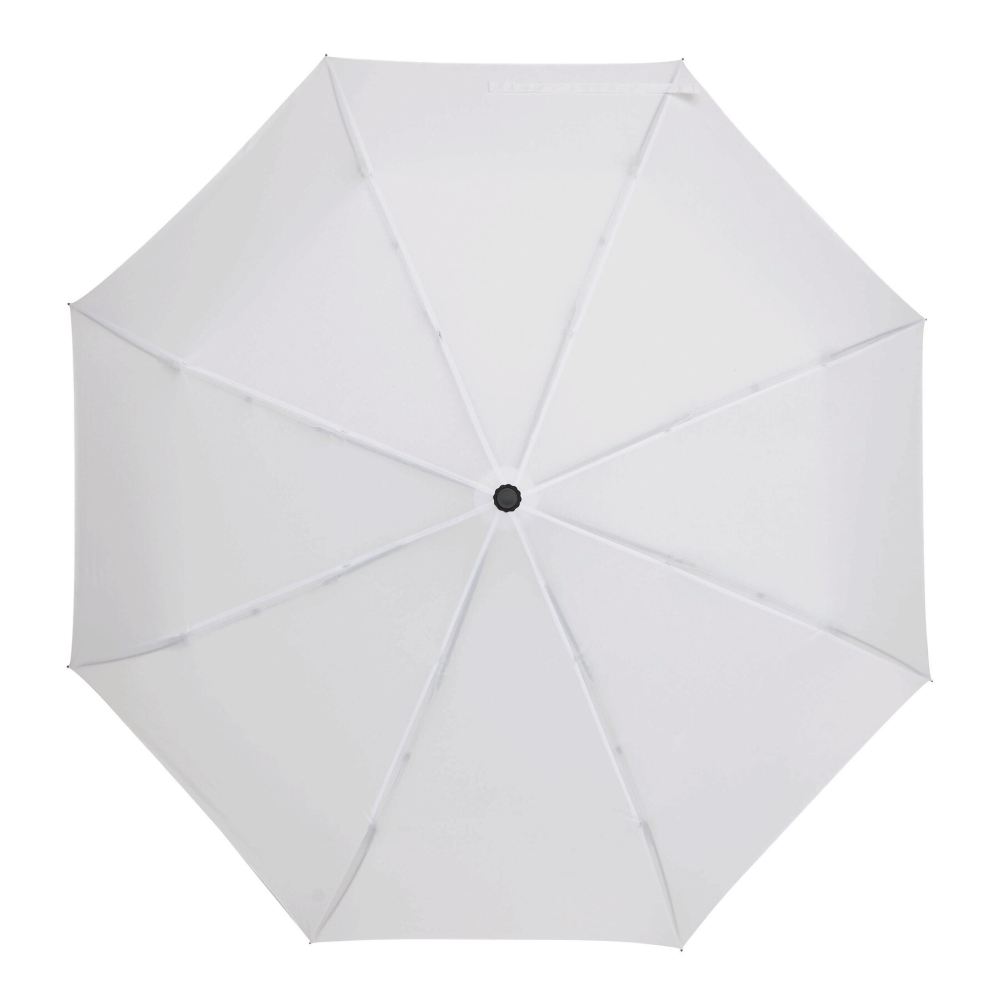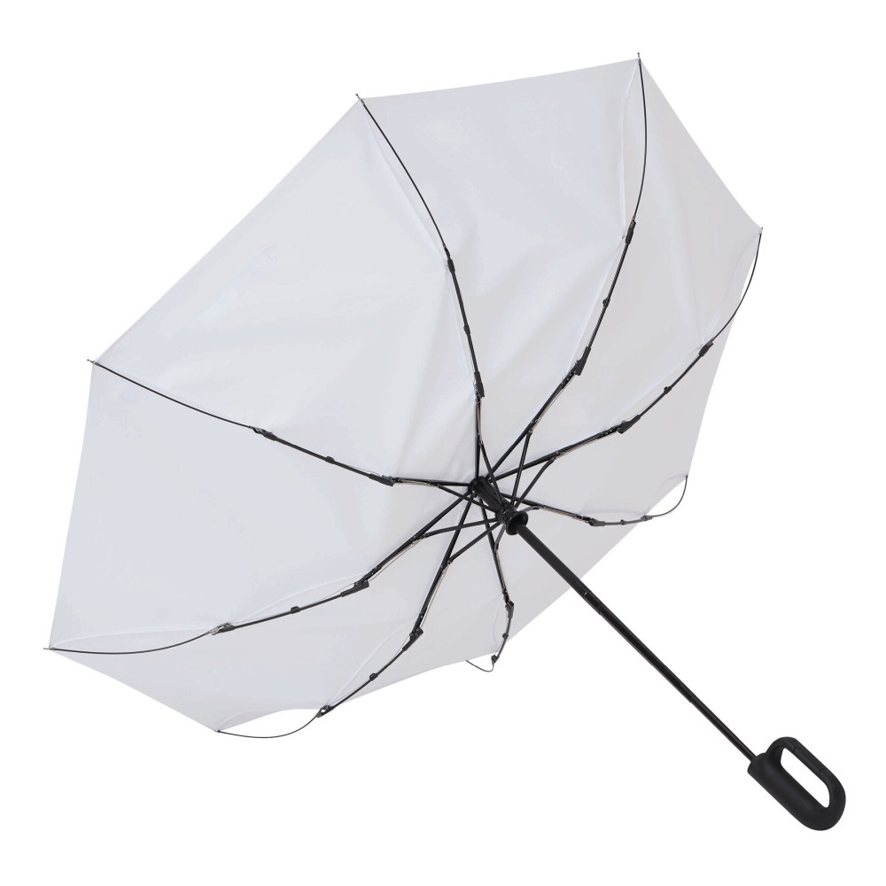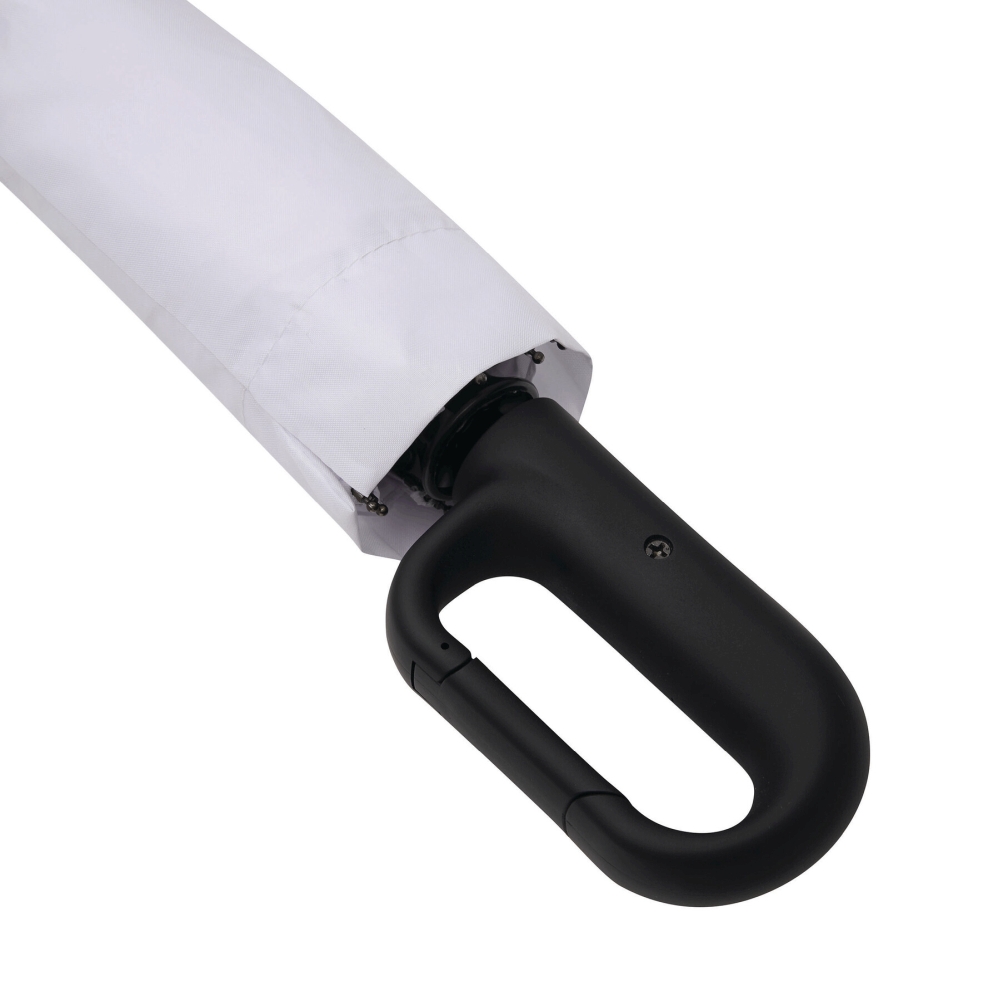 Automatic open/close windproof pocket umbrella with sheath in matching colour: 3-section metal shaft, with metal/fibreglass ribs and metal tips, rubber-coated carabiner handle, polyester pongee canopy made from recycled plastic / rPET, closing strap with Velcro. Dimensions: O98 / 33-60 cm