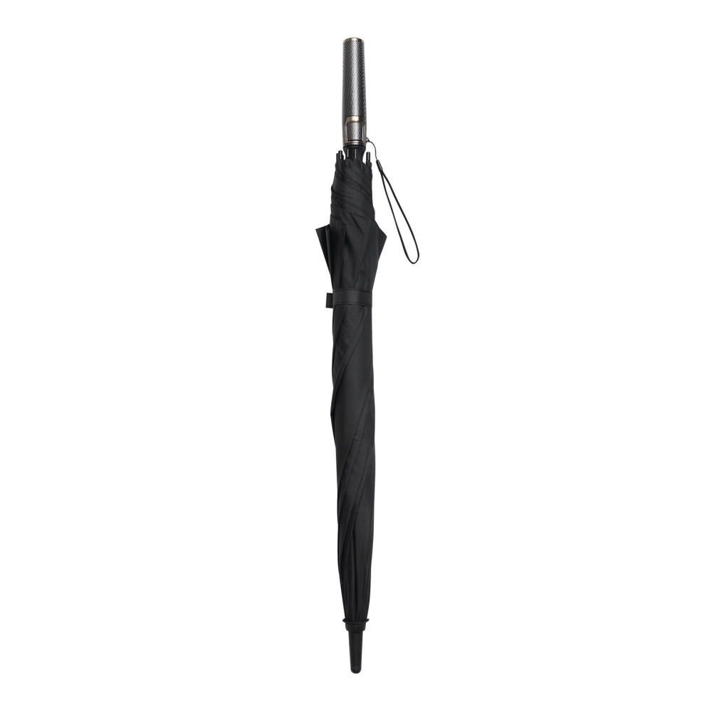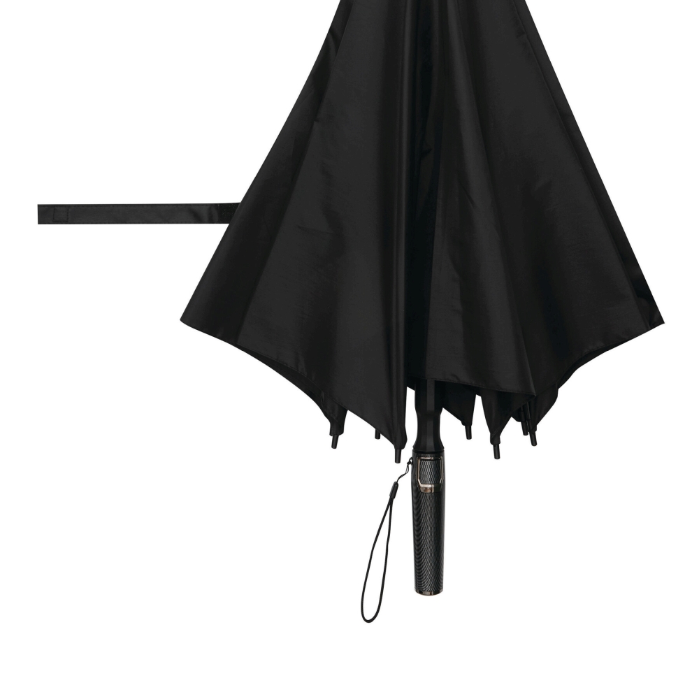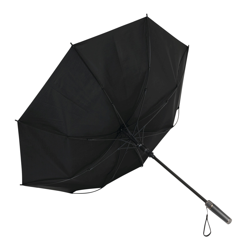 Automatic stick umbrella with fibreglass shaft, fibreglass ribs, plastic tips, plastic handle in carbon optic with integrated press button and carrying loop, premium quality polyester pongee canopy, closing strap with Velcro. Dimensions: O106 / 81,5 cm
