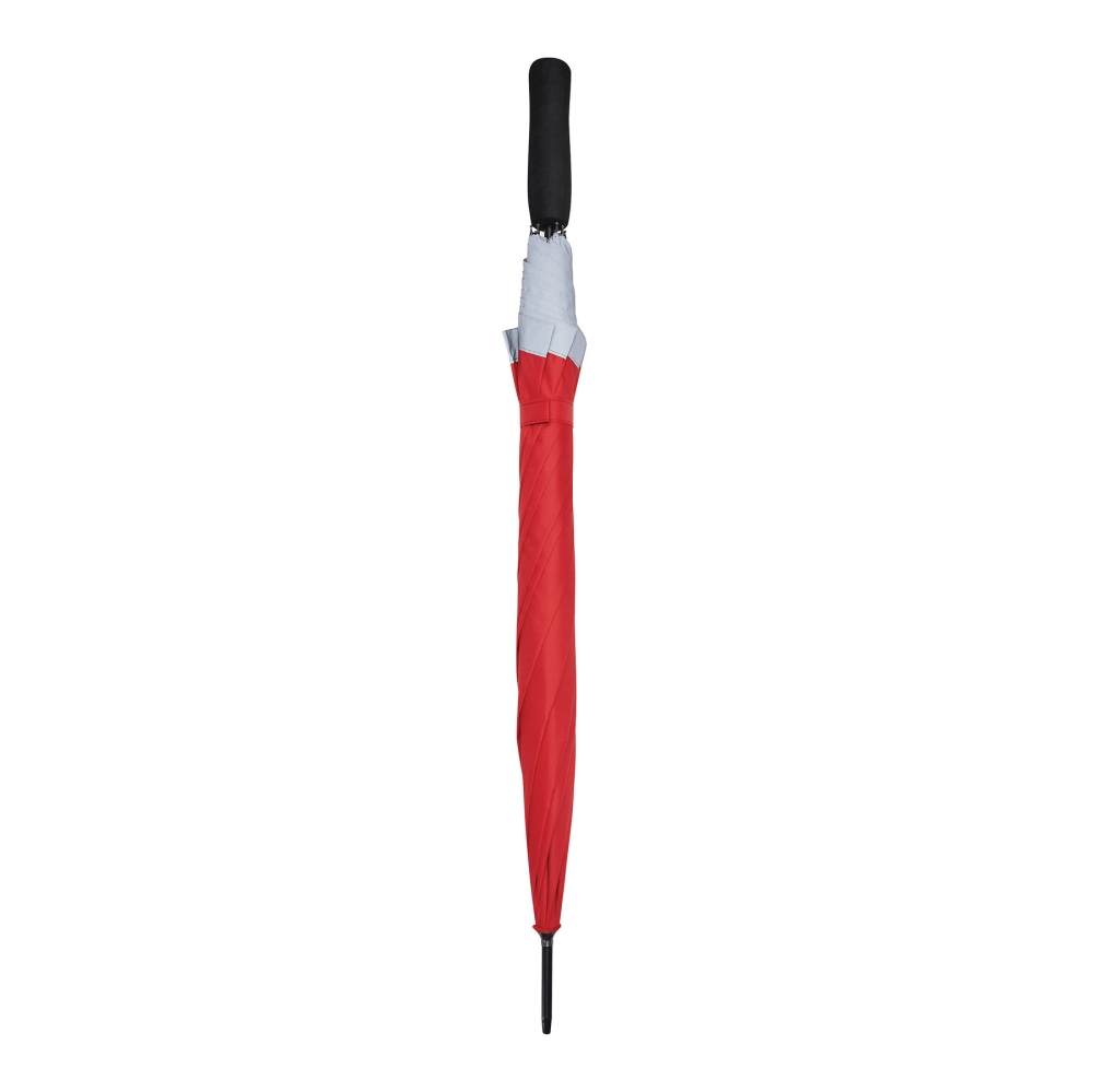 Automatic stick umbrella. Metal shaft, fibreglass ribs, and metal tips, EVA handle, polyester pongee canopy made from recycled plastic / RPET, with silver reflective stripe, closure with Velcro. Dimensions: O105 / 83 cm