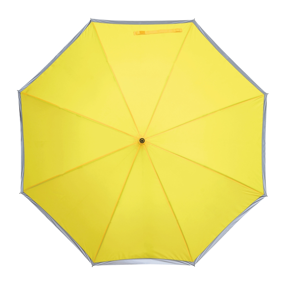 Automatic stick umbrella. Metal shaft, fibreglass ribs, and metal tips, EVA handle, polyester pongee canopy made from recycled plastic / RPET, with silver reflective stripe, closure with Velcro. Dimensions: O105 / 83 cm