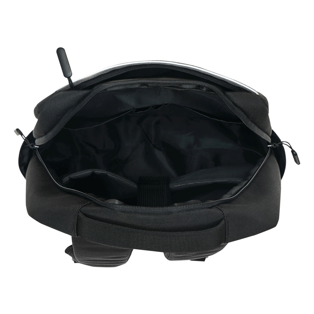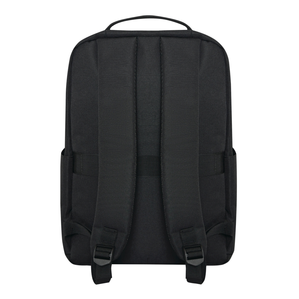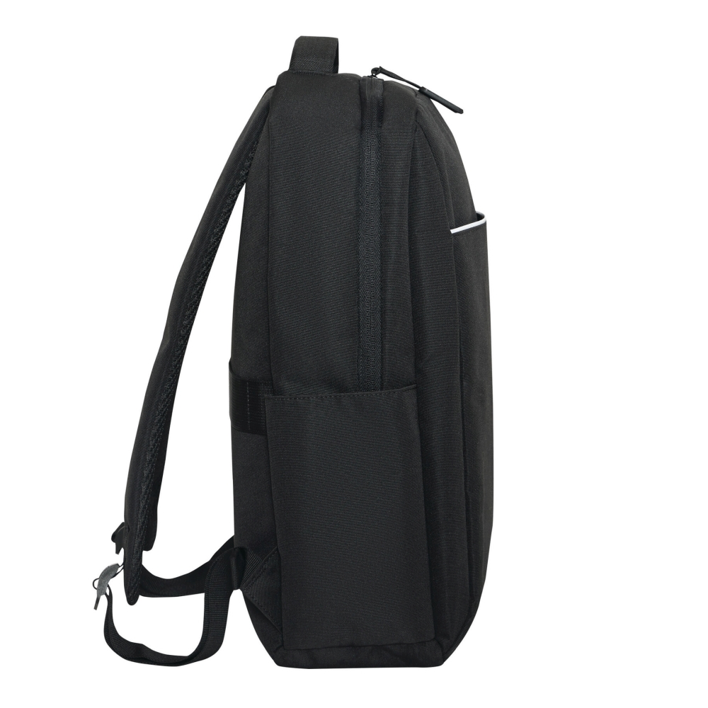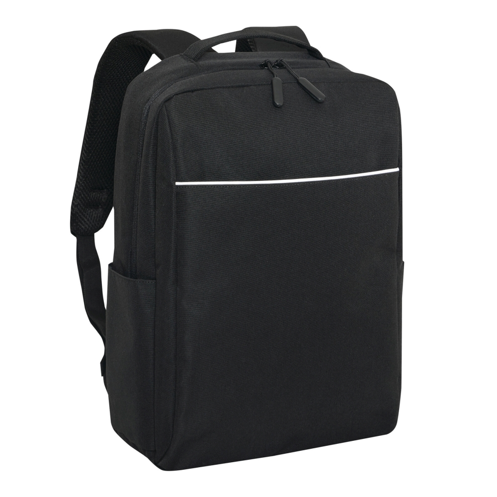 Backpack made of recycled polyester (rPET), 1 zipped front pocket with reflector strip, zipped main compartment with padded interior compartment for laptop or tablet, organiser with 4 slip-in pockets, 2 lateral slip-in pockets, padded grab handle, padded and adjustable shoulder straps, trolley sleeve. Dimensions: 41 x 11 x 28 cm