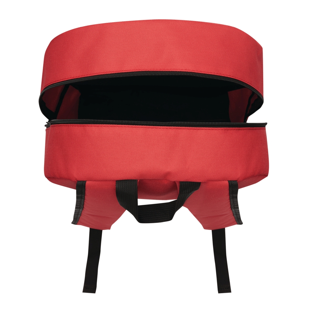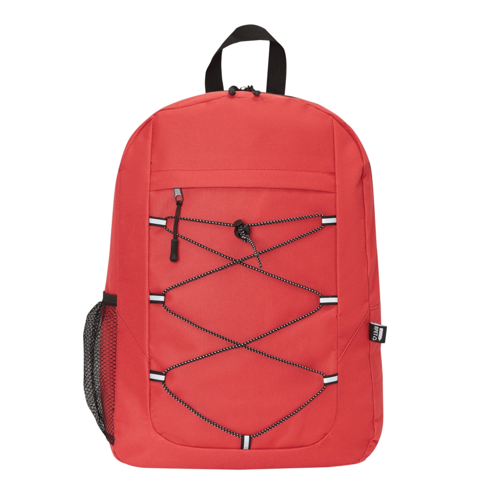 Backpack made of recycled polyester (rPET), zipped main compartment, zipped front pocket with adjustable elastic drawstring, carrying loop, 1 lateral mesh pocket, padded bottom, adjustable padded shoulder straps. Dimensions: 30 x 15 x 43 cm
