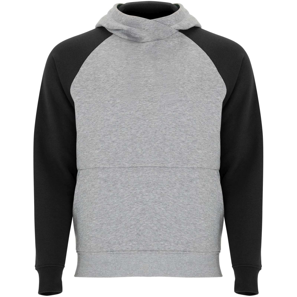Two-colour unisex hoodie. Hood with crossed neck and metal eyelets. Contrasting inner hood, drawcord and raglan sleeves. Kangaroo pocket. Cuffs and hem in 1x1 elastane rib knit. Removable label.