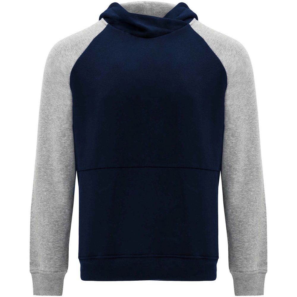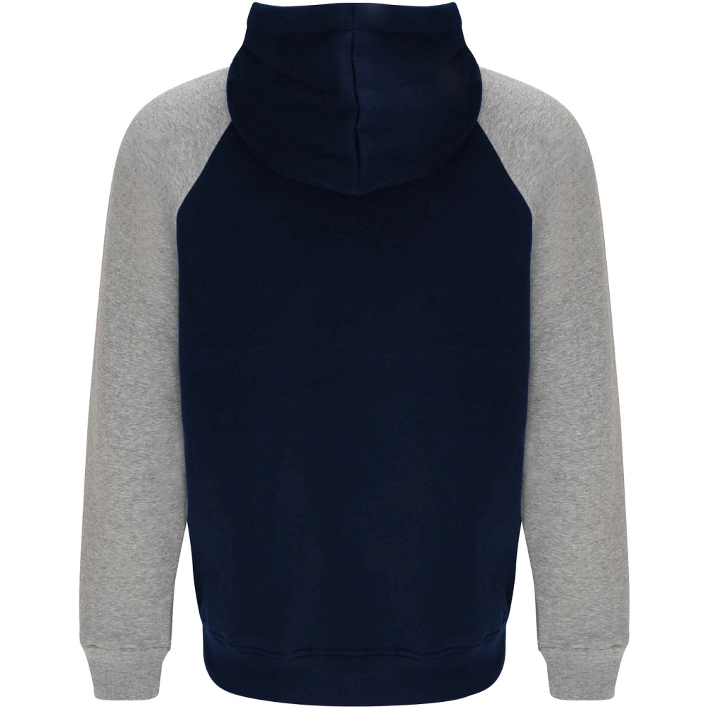 Two-colour unisex hoodie. Hood with crossed neck and metal eyelets. Contrasting inner hood, drawcord and raglan sleeves. Kangaroo pocket. Cuffs and hem in 1x1 elastane rib knit. Removable label.