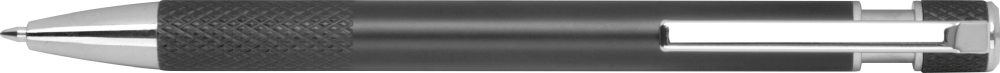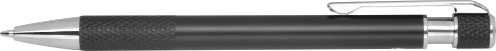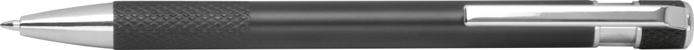 Ballpoint pen made from recycled aluminum with patterned grip zone, push mechanism, and blue ink. Dimensions: o 1 x 14,2 cm