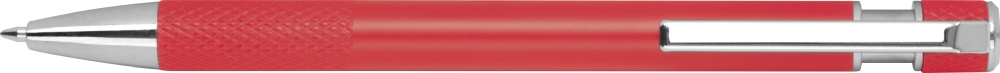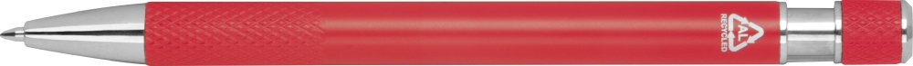 Ballpoint pen made from recycled aluminum with patterned grip zone, push mechanism, and blue ink. Dimensions: o 1 x 14,2 cm