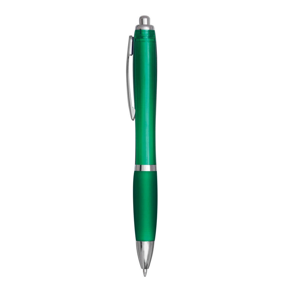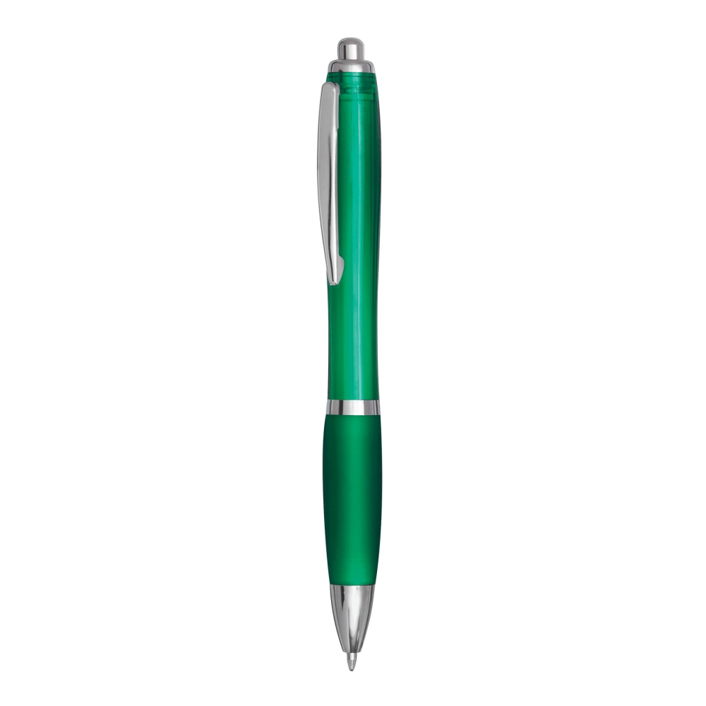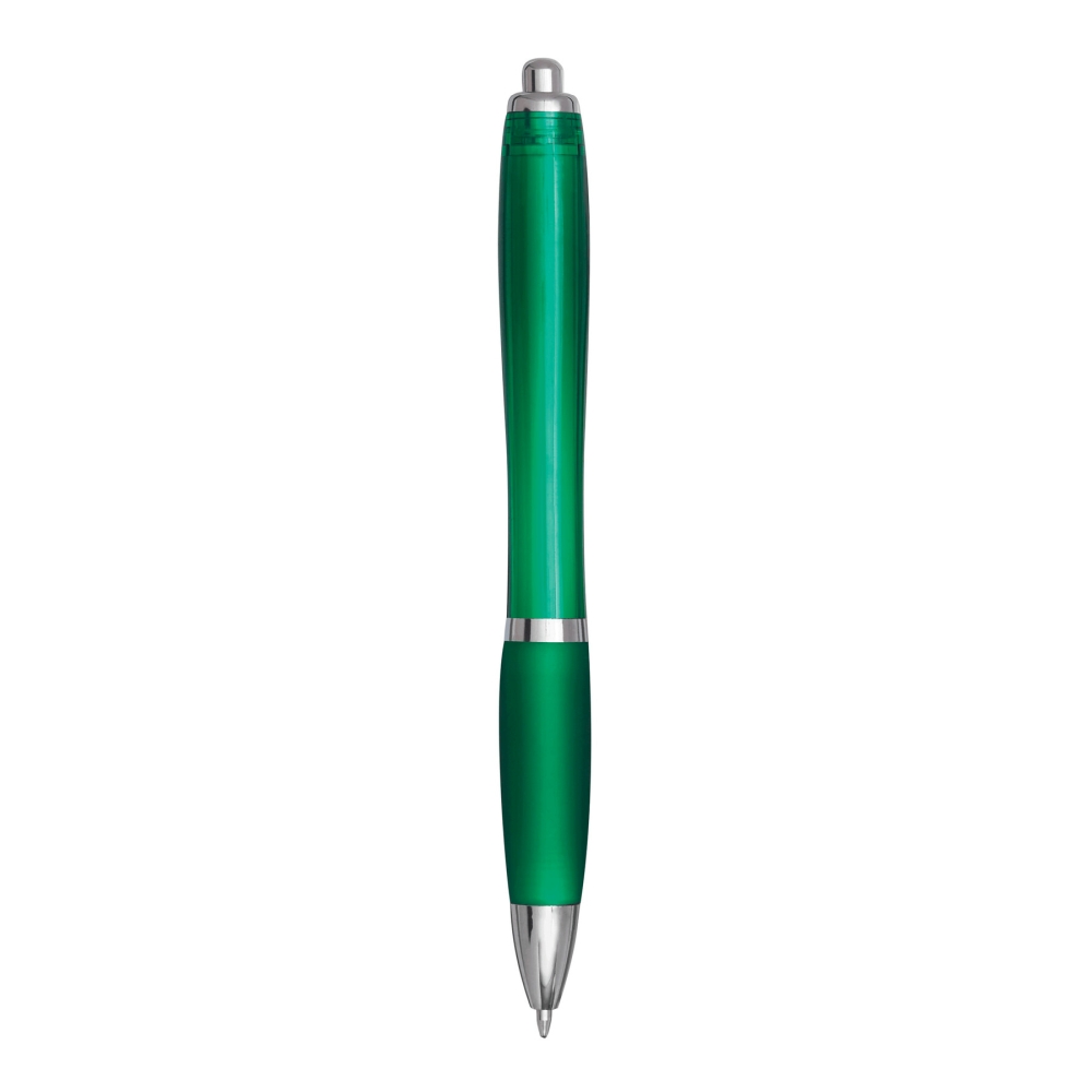 Ballpoint pen with curvy barrel made of recycled plastic, rubberised grip, push mechanism, jumbo refill, blue ink. Dimensions: 14 cm