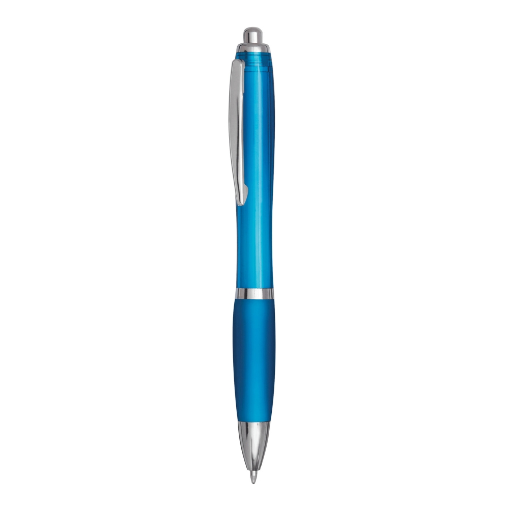 Ballpoint pen with curvy barrel made of recycled plastic, rubberised grip, push mechanism, jumbo refill, blue ink. Dimensions: 14 cm