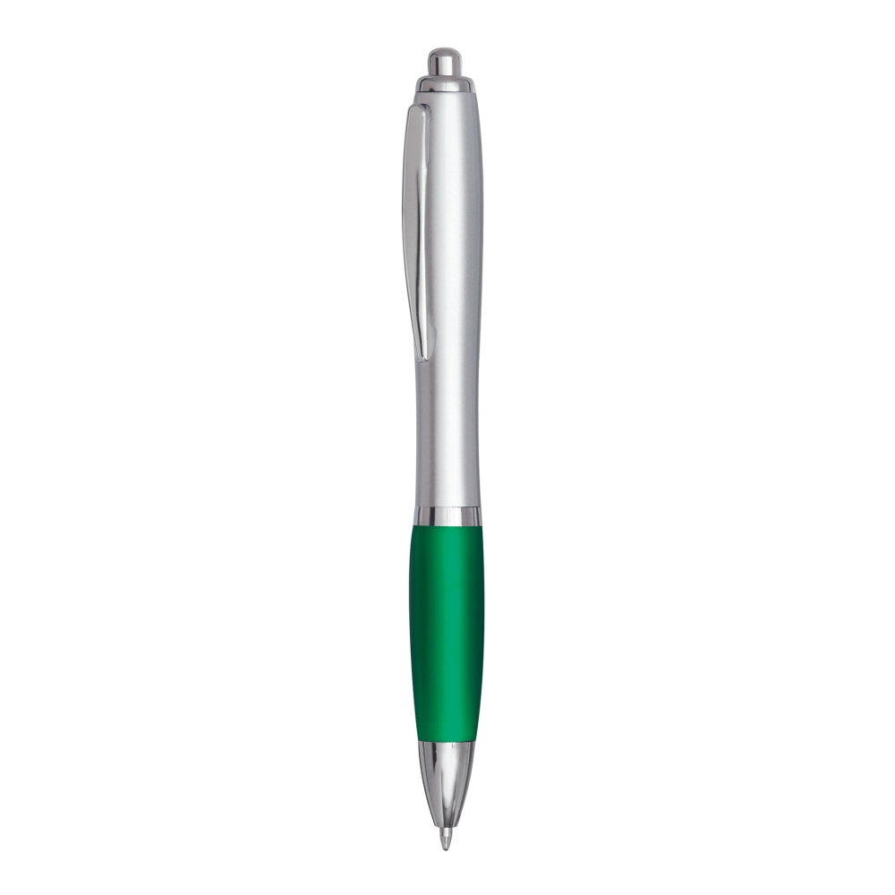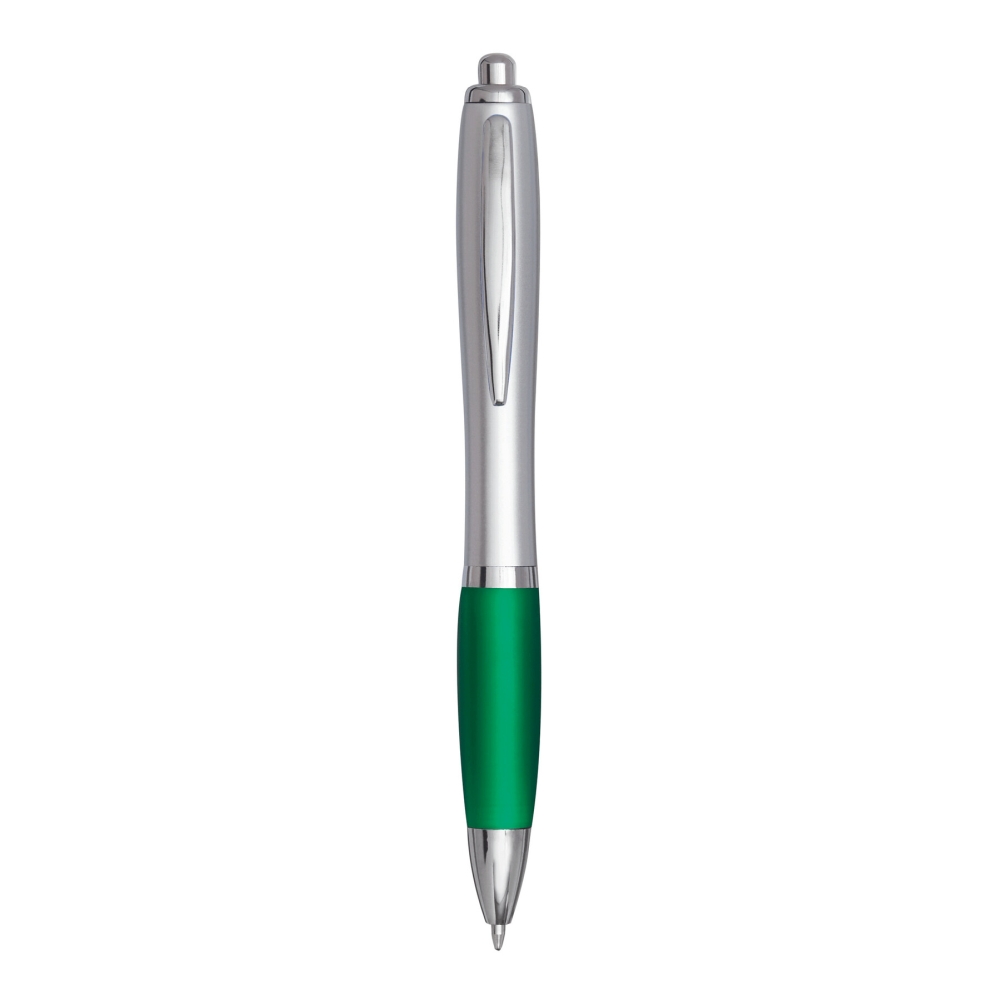 Ballpoint pen with curvy barrel made of recycled plastic, rubberised grip, push mechanism, jumbo refill, blue ink. Dimensions: 14 cm
