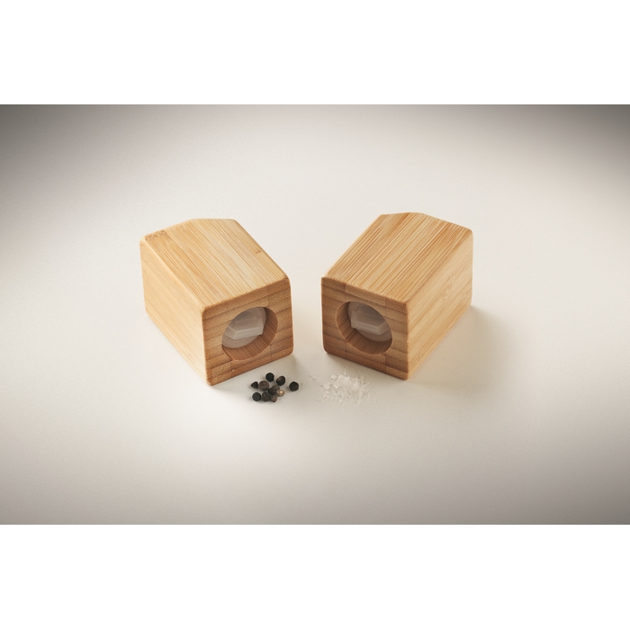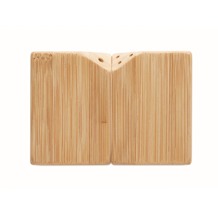 Magnetic bamboo salt and pepper set with PP plug closure at the base. The two shakers connect magnetically. Dimensions: 10 x 5 x 7 cm