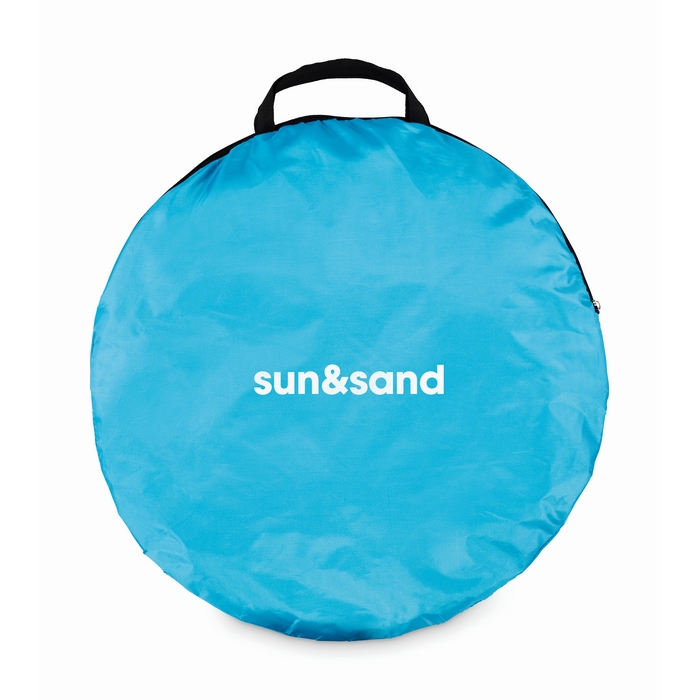 Two-person beach tent made of 190T polyester. Includes 6 steel hooks and a matching carry bag. Lightweight and easy to set up. Designed for shade and outdoor comfort. Dimensions: 160 x 140 x 110 cm