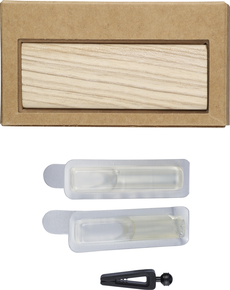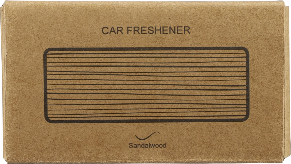 Natural beechwood car refresher with 2 × 3 g alcohol-free sandalwood scent (one pre-filled, one refill). Includes ABS clip for car vent. Packed in brown cardboard box with illustration. Dimensions: 3,3 cm x 11,5 cm