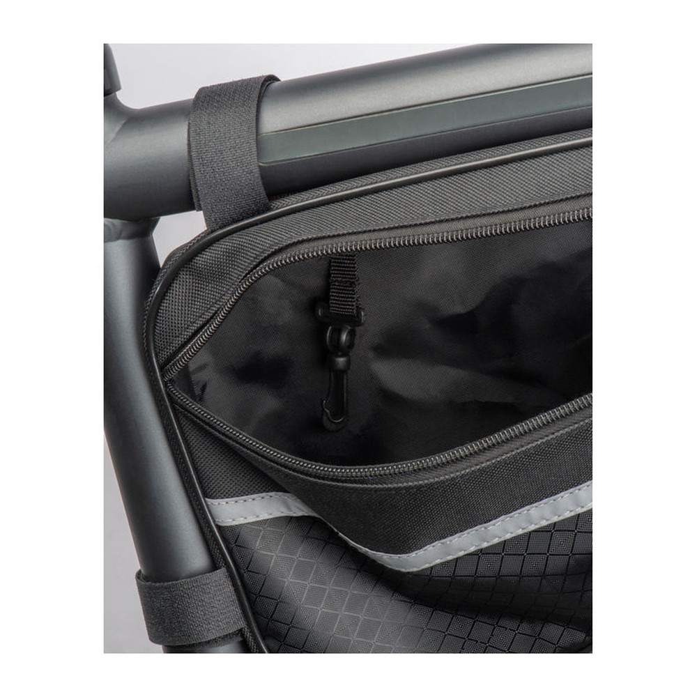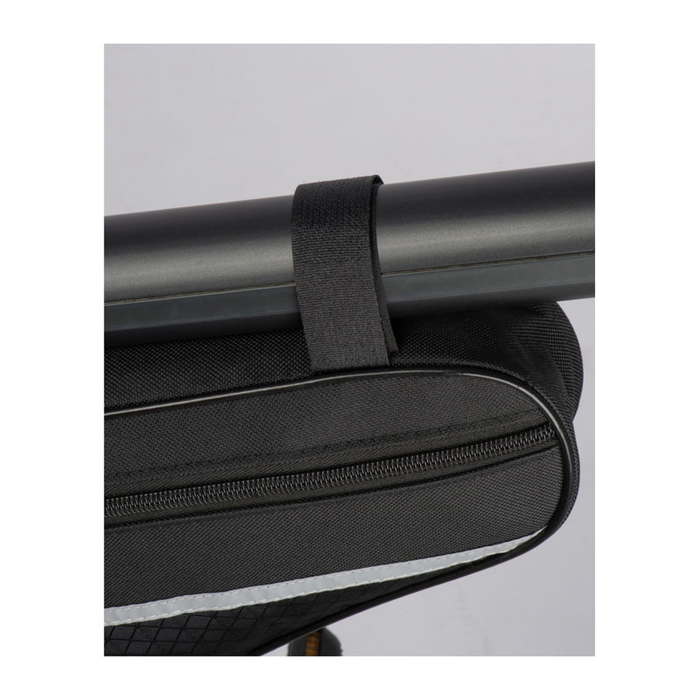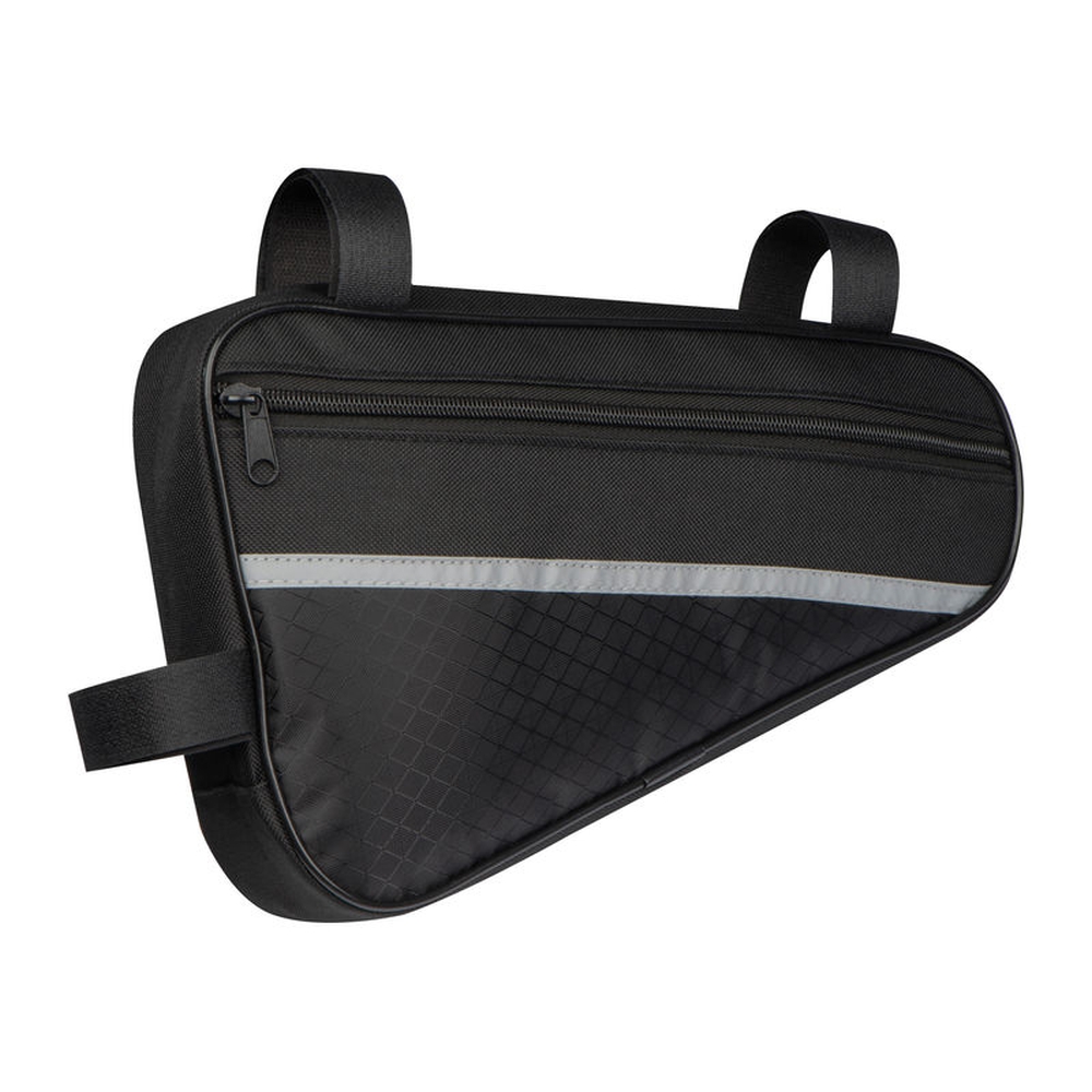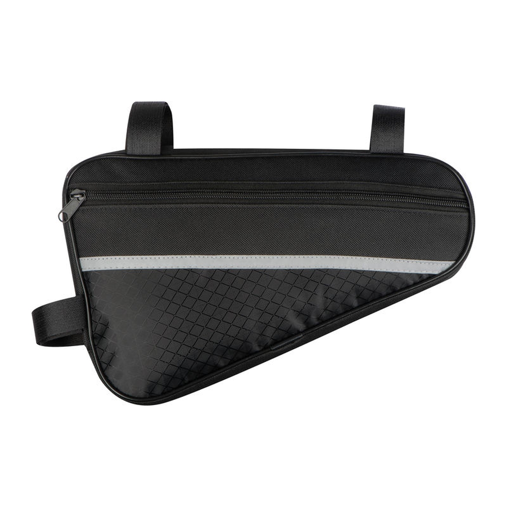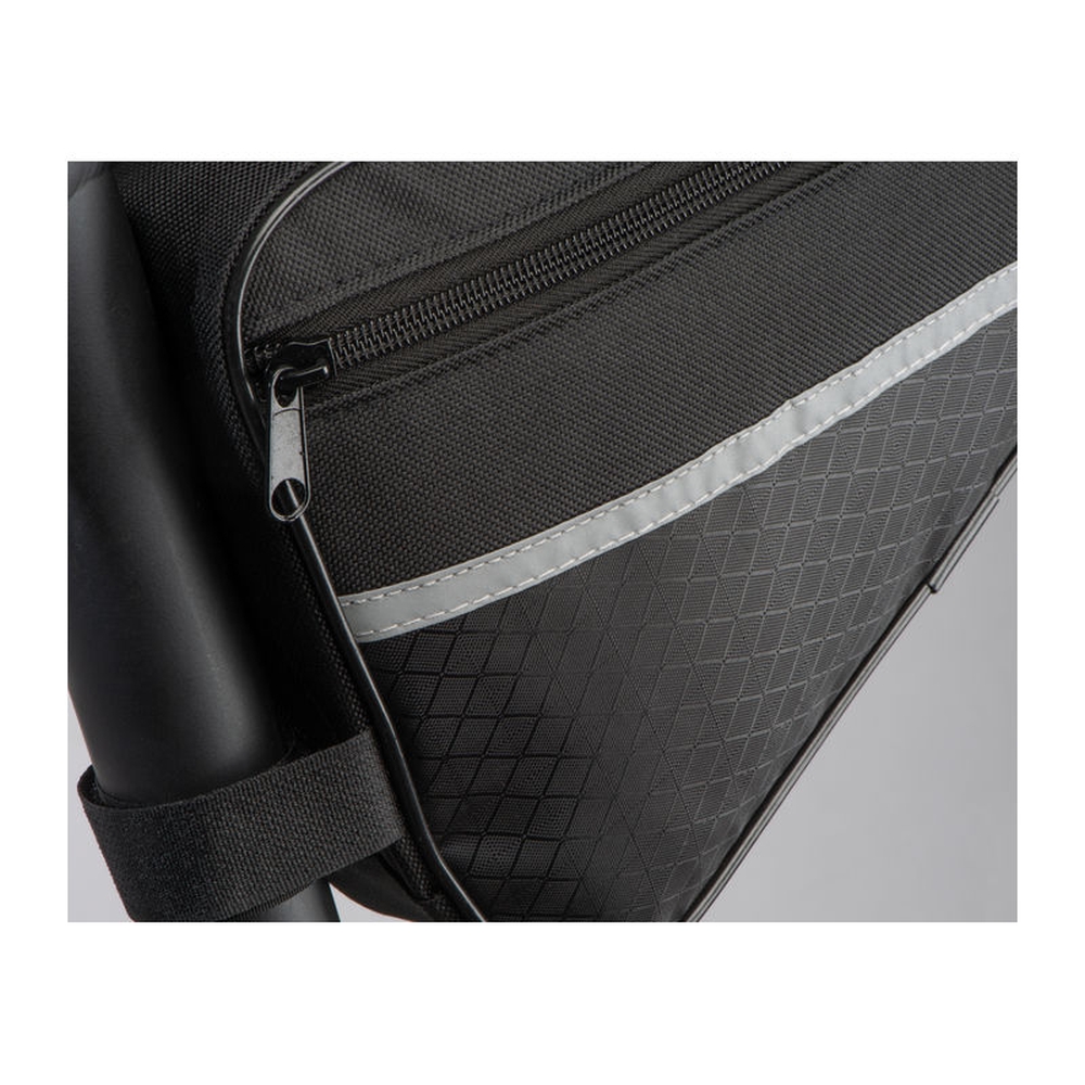 Bicycle bag made of durable 600D polyester with reflective strips. The bag can be easily attached to the middle frame bar using the brackets and offers enough space for all important items. Dimensions: 30 × 7,5 × 19 cm