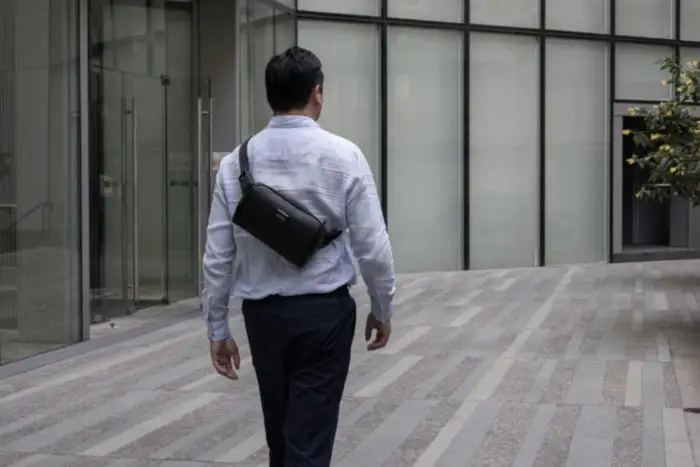 The BrandCharger Edge Crossbody Bag combines sustainability, function, and style. Made from 800D recycled water- and stain-repellent fabric with vegan leather accents. Features adjustable strap, SBS zipper, sidelock buckle, shockproof padded compartment, and removable keychain. Ideal for daily use. Dimensions: 14 cm x 49 cm
