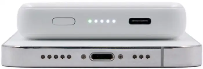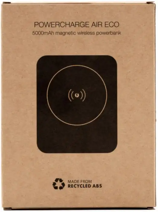 Powercharge Air is an ultra-slim, pocket-sized magnetic wireless powerbank made from recycled ABS. With a 5,000 mAh capacity, it supports 5W magnetic wireless charging compatible with MagSafe, Qi1, and Qi2 standards. Also features a 12W USB-C port for wired charging. Includes a smart safety chip for protection against overcurrent, overdischarge, overcharging, overheating, and short-circuiting. Equipped with LED indicator and smart performance engine. USB-C input: 5V. Wireless output: 5W. Dimensions: 1,4 cm x 7,7 cm