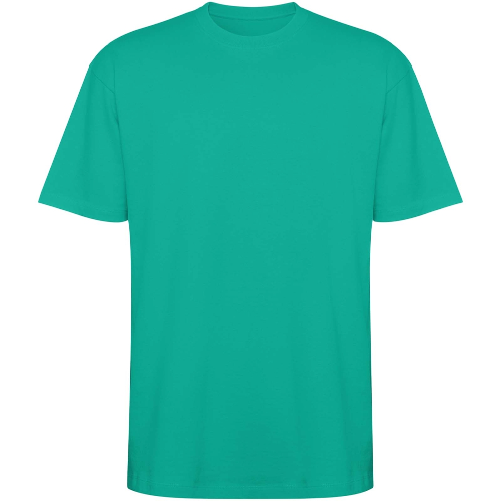 Oversized short sleeve t-shirt. Round collar trimmed in 2x1 rib with matching seam covers. Side seams. Wide double stitching on the sleeves and hem. Removable label.