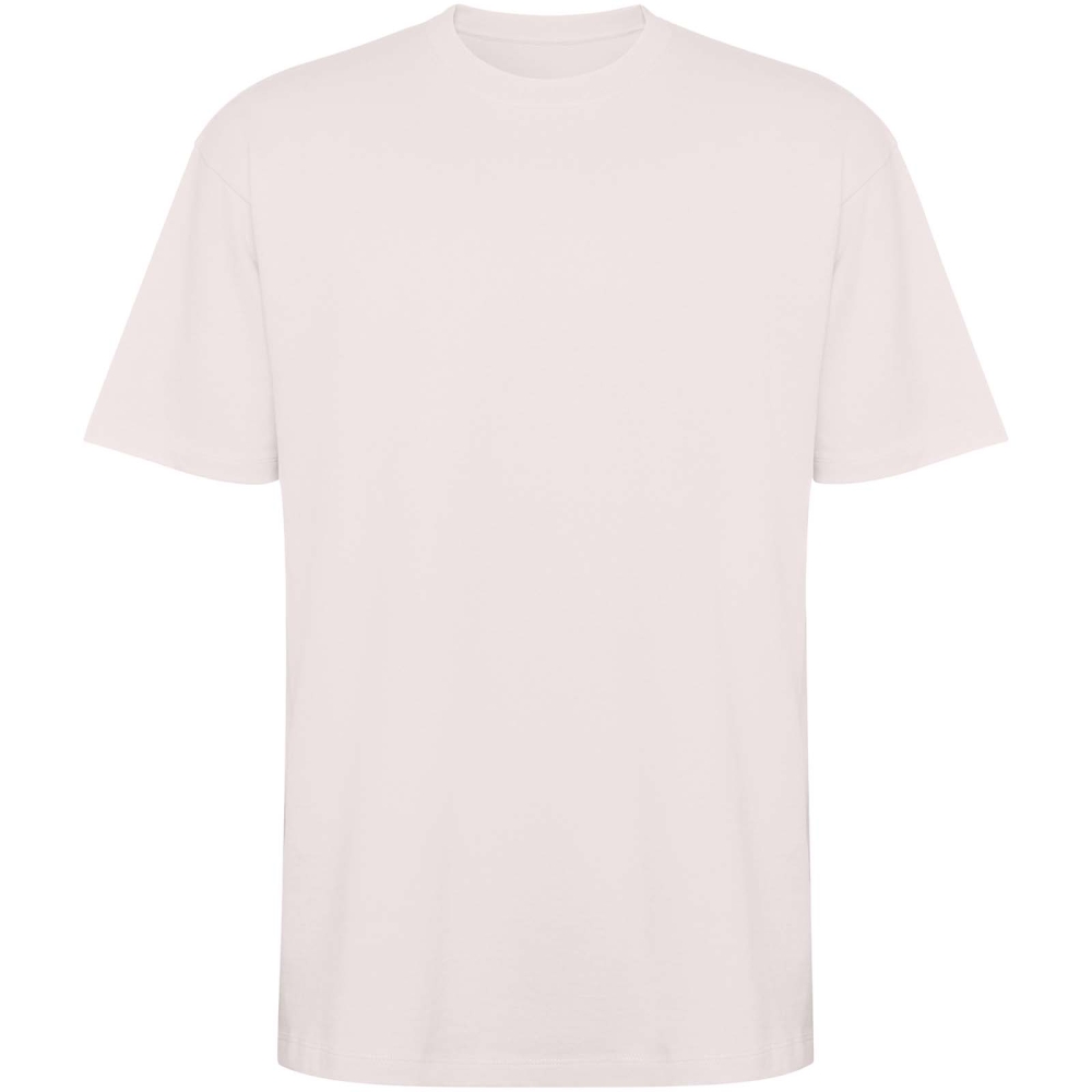 Oversized short sleeve t-shirt. Round collar trimmed in 2x1 rib with matching seam covers. Side seams. Wide double stitching on the sleeves and hem. Removable label.