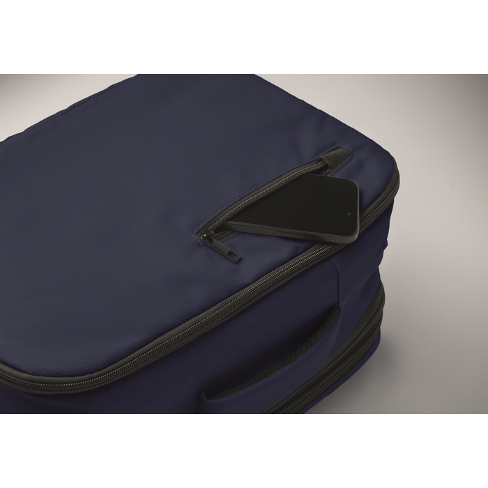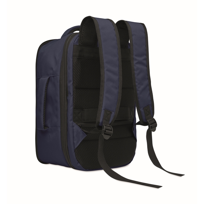 Cabin-size carry-on extendable backpack made of 600D RPET polyester with 180o opening. Features a main compartment with two open sections, mesh division, padded 15" laptop pocket, and luggage strap. Dimensions: 25 x 20 x 40 cm