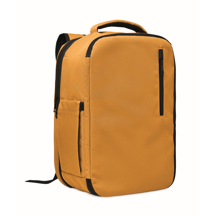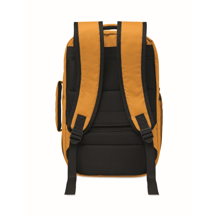 Cabin-size carry-on extendable backpack made of 600D RPET polyester with 180o opening. Features a main compartment with two open sections, mesh division, padded 15" laptop pocket, and luggage strap. Dimensions: 25 x 20 x 40 cm
