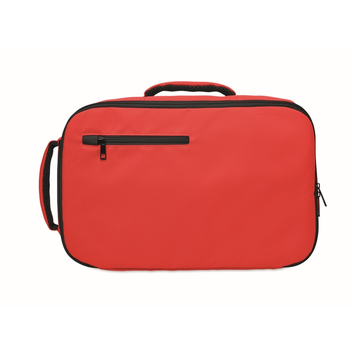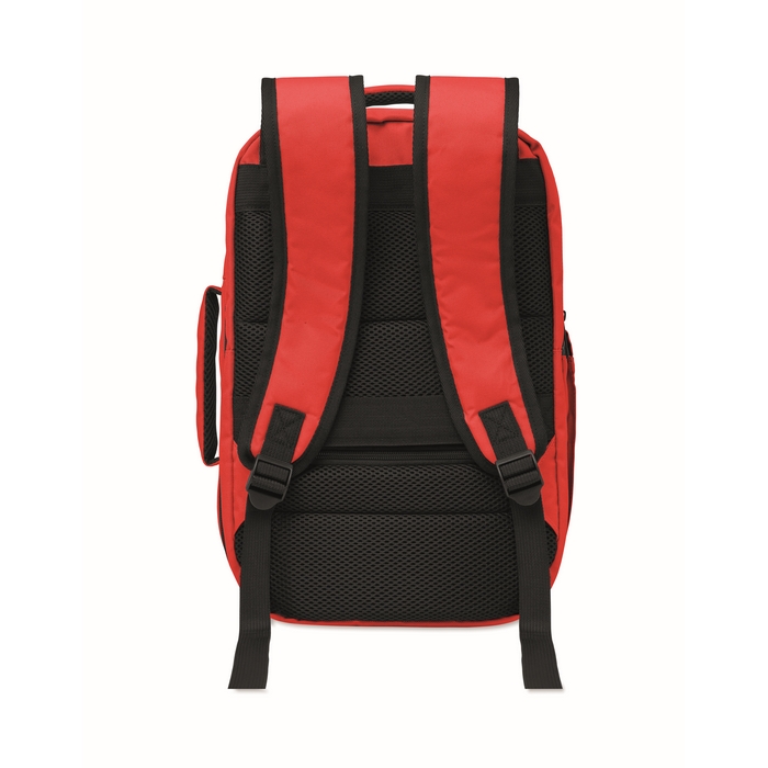 Cabin-size carry-on extendable backpack made of 600D RPET polyester with 180o opening. Features a main compartment with two open sections, mesh division, padded 15" laptop pocket, and luggage strap. Dimensions: 25 x 20 x 40 cm